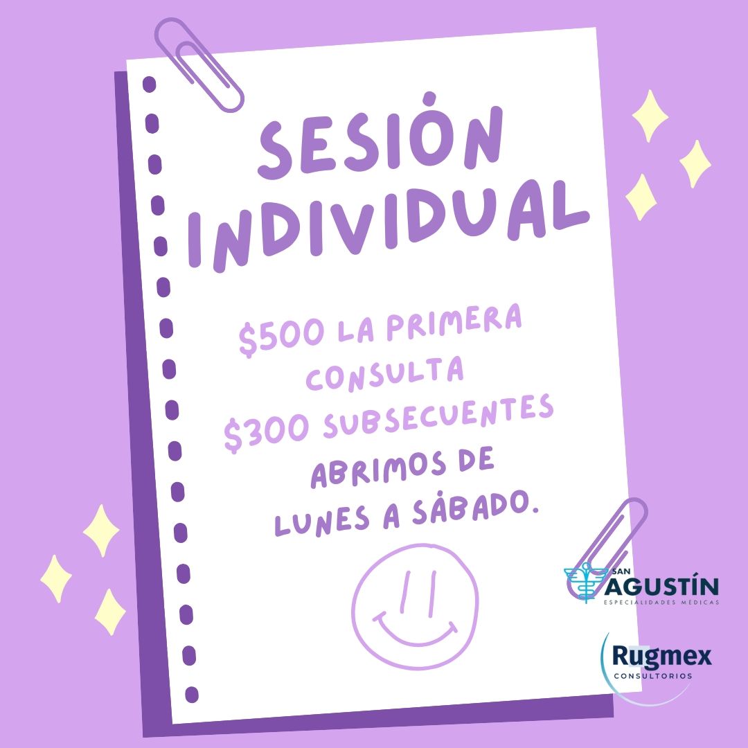 Sesiones individuales en $500 solo la primera consulta, las subsecuentes en $300, online o presencial.