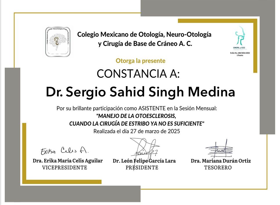 Tuve una experiencia muy positiva con el Dr. Sergio Sahid Singh Medina, un excelente especialista en otorrinolaringología. Es muy atento, explica todo con claridad y se toma el tiempo para escuchar re...