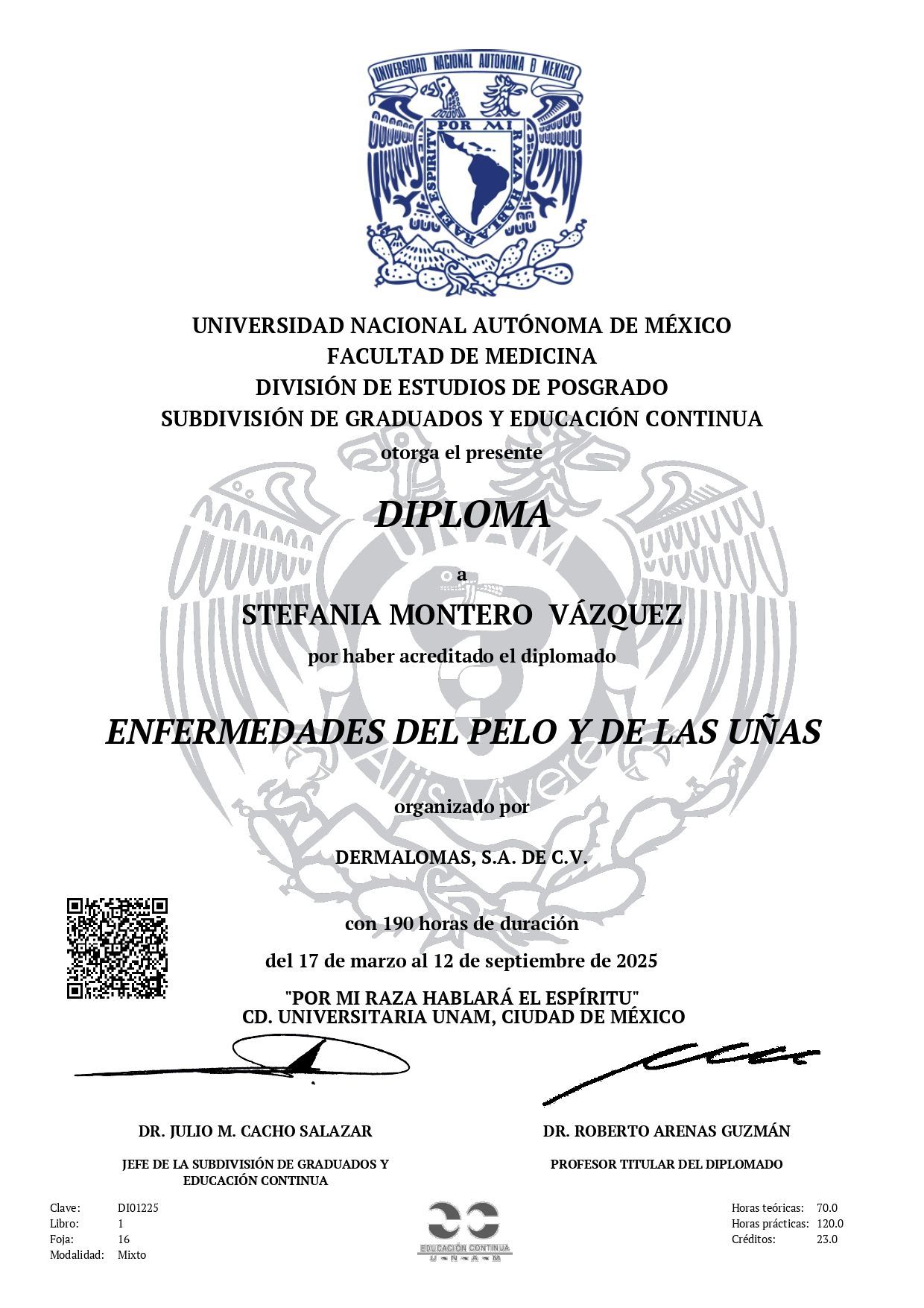 Con el deseo de brindar una atención más completa y especializada, también realicé un diplomado presencial en Dermatología Pediátrica en el Instituto Nacional de Pediatría, así como un diplomado avalado por la UNAM en Tricología y Patologías Ungueales.