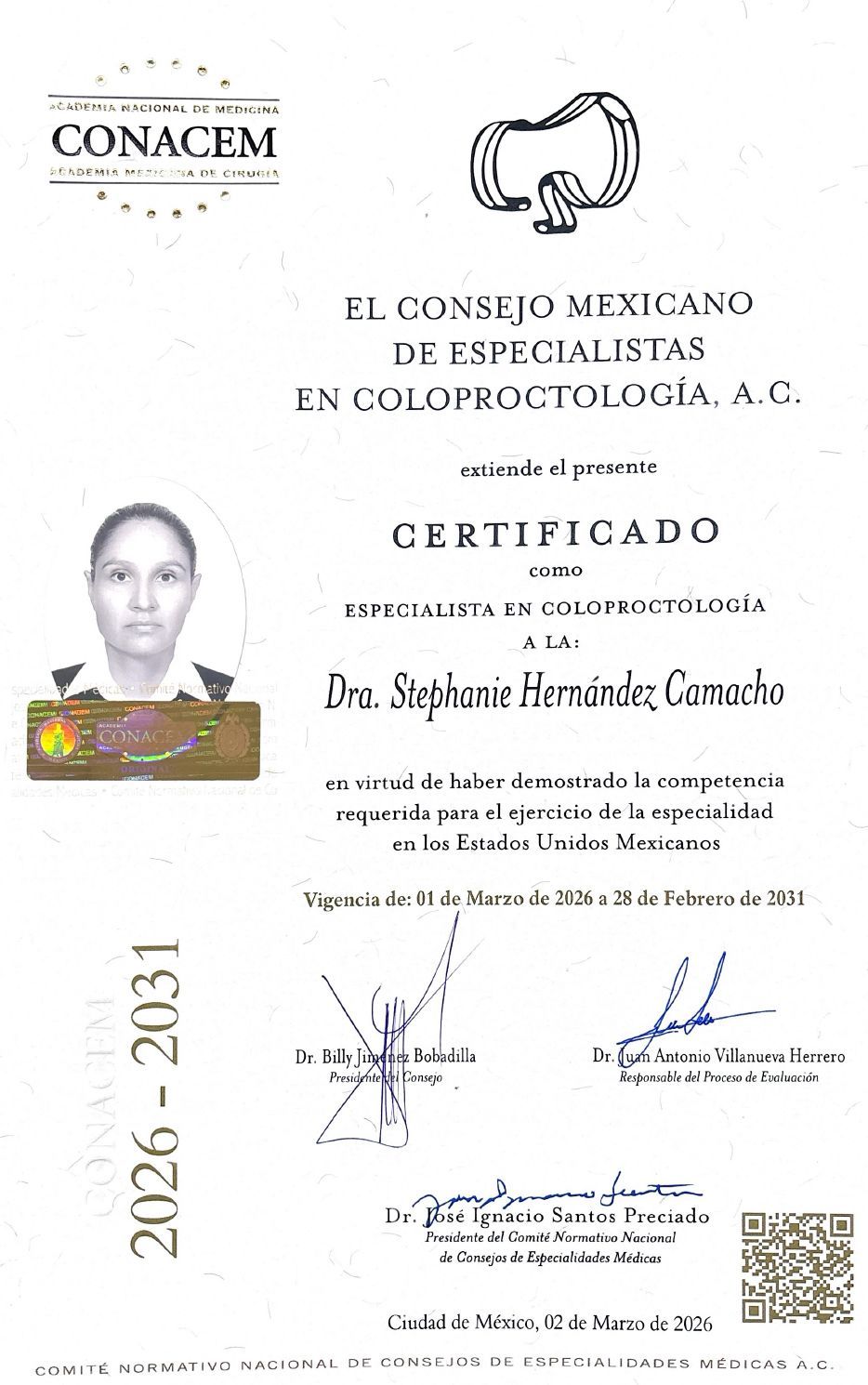 Subespecialidad en Coloproctología (Cirugía Colorrectal), por el Instituto Nacional de Ciencias Médicas y Nutrición Salvador Zubirán (INCMNSZ).