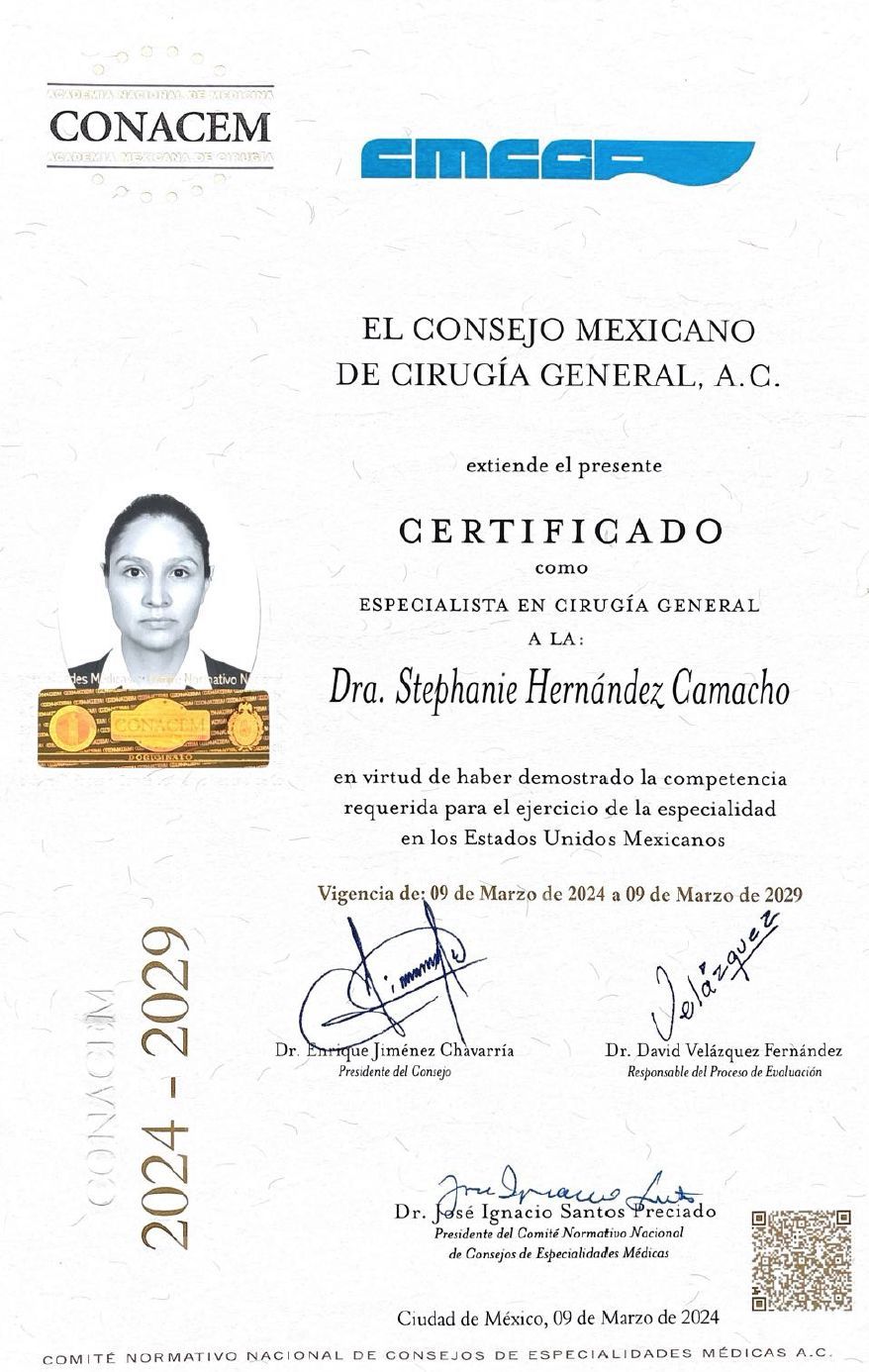 Especialidad en Cirugía General, por el Instituto Nacional de Ciencias Médicas y Nutrición Salvador Zubirán (INCMNSZ).
