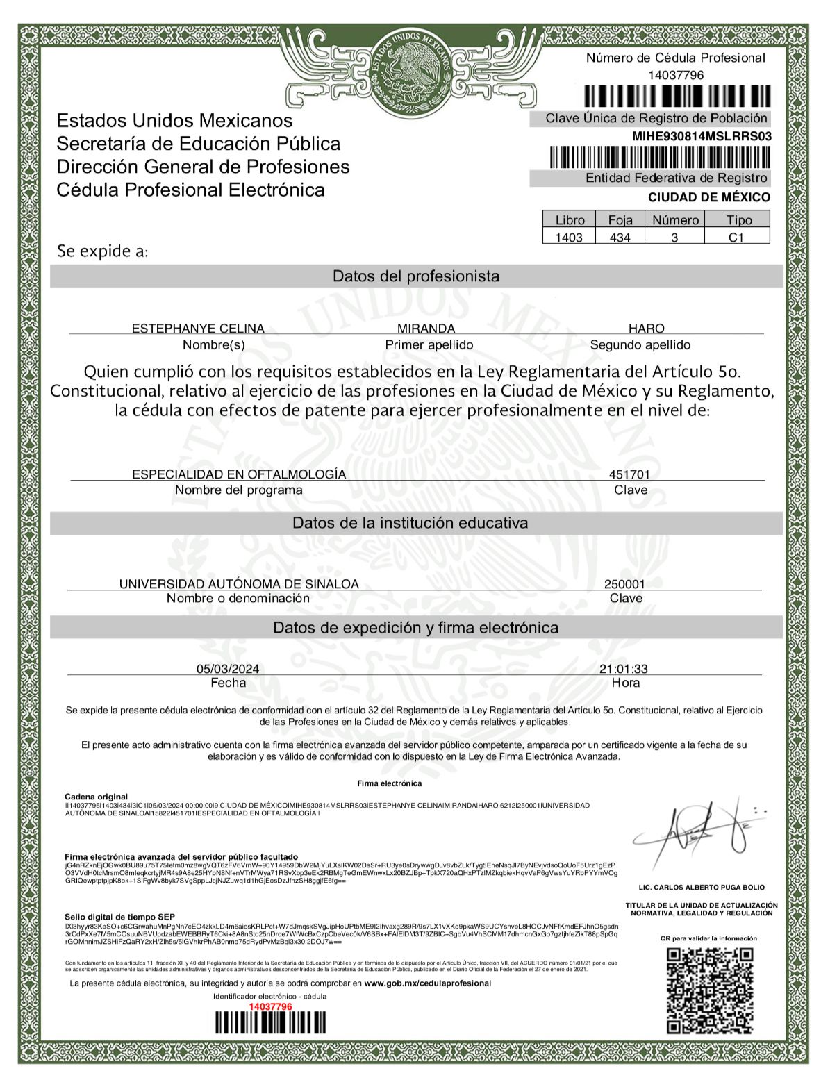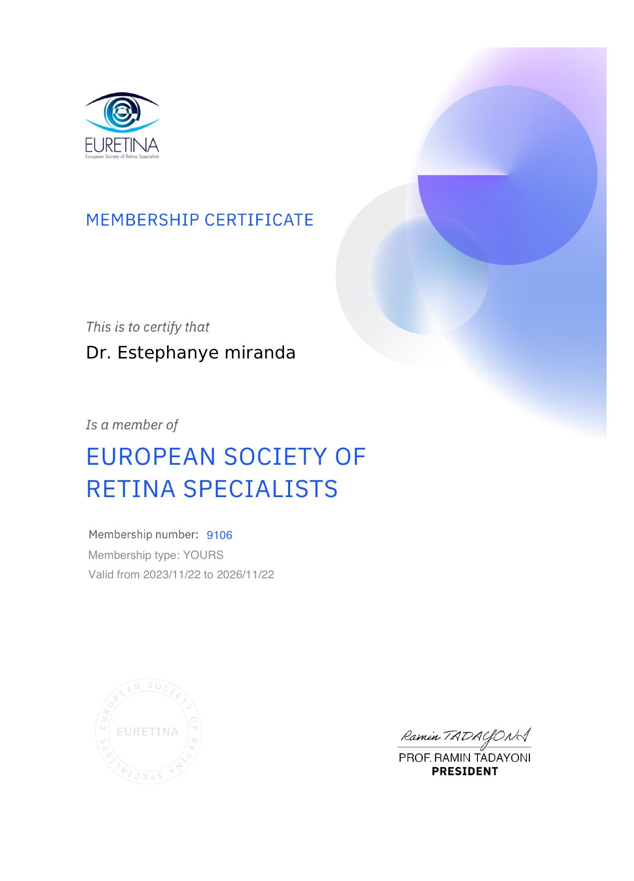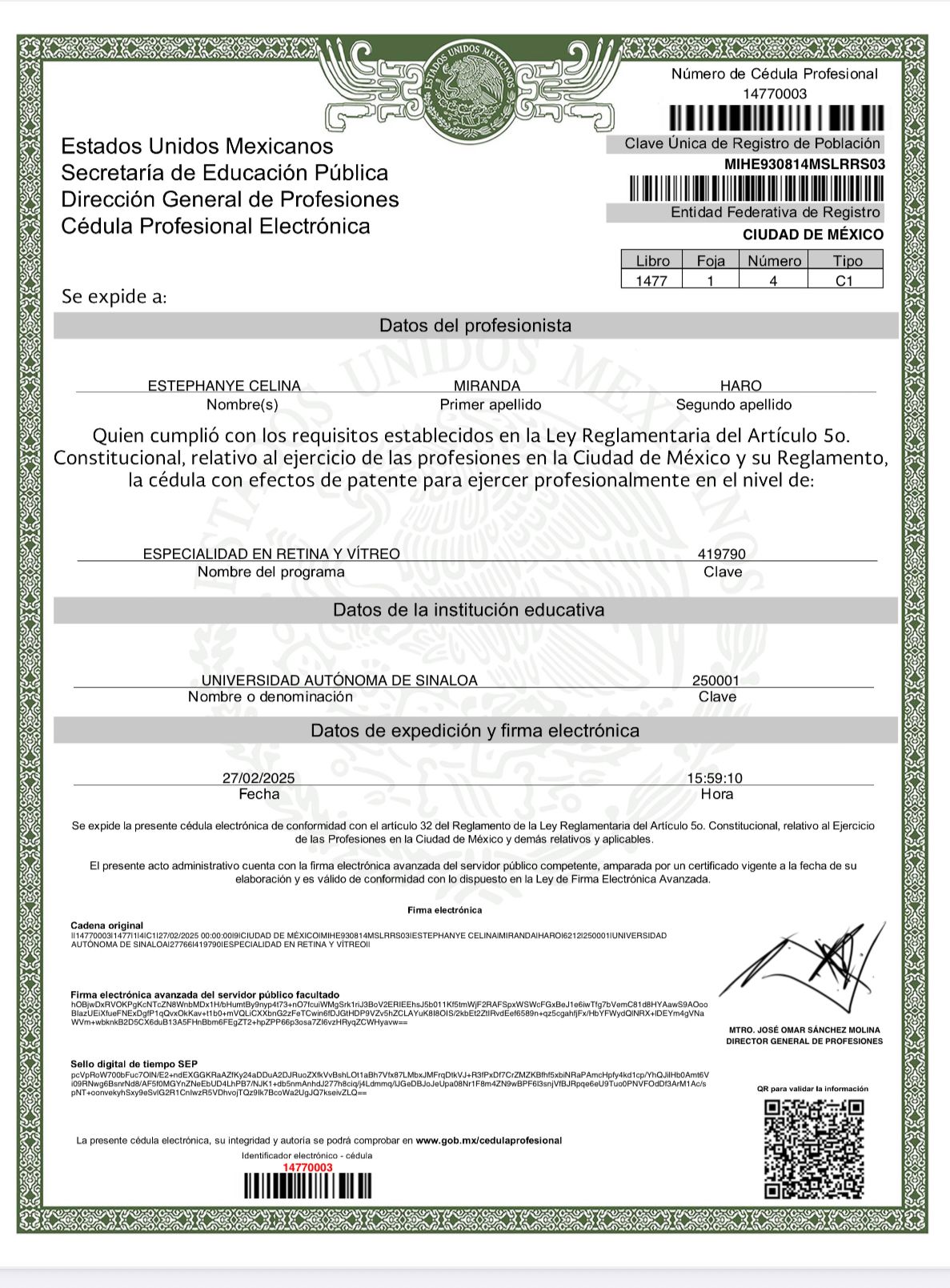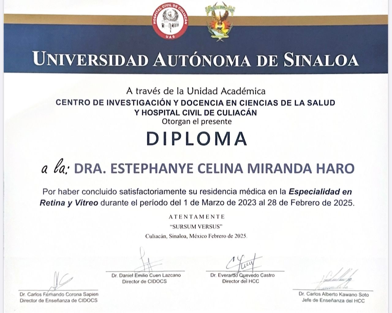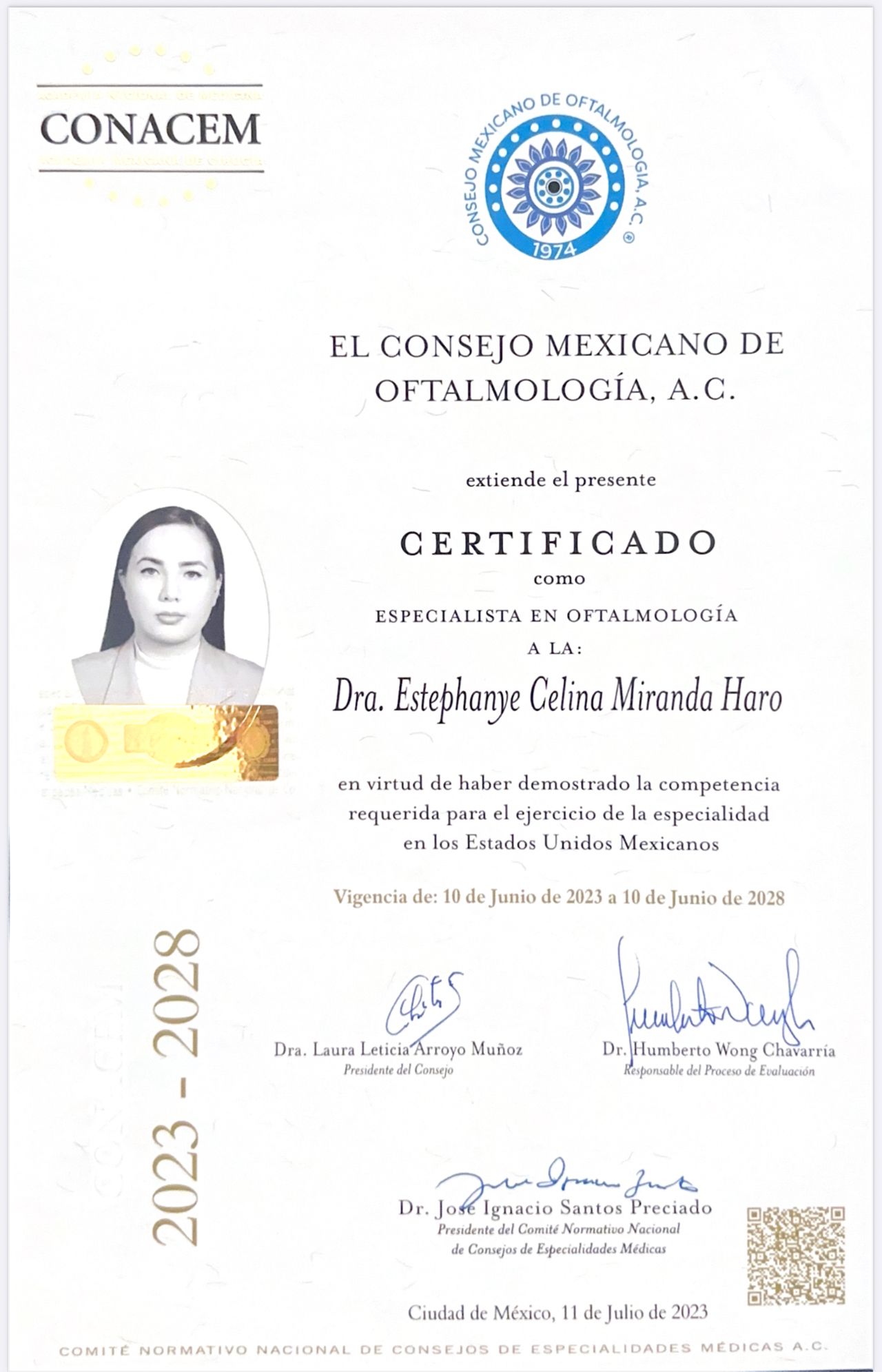 Cirujana Oftalmóloga certificada con alta especialidad en cirugía de Retina y Vítreo.