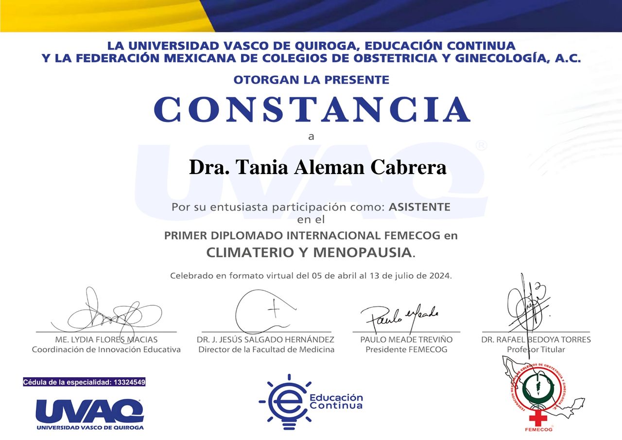 Cuento con Diplomado en Colposcopía además de un Diplomado en Menopausia.