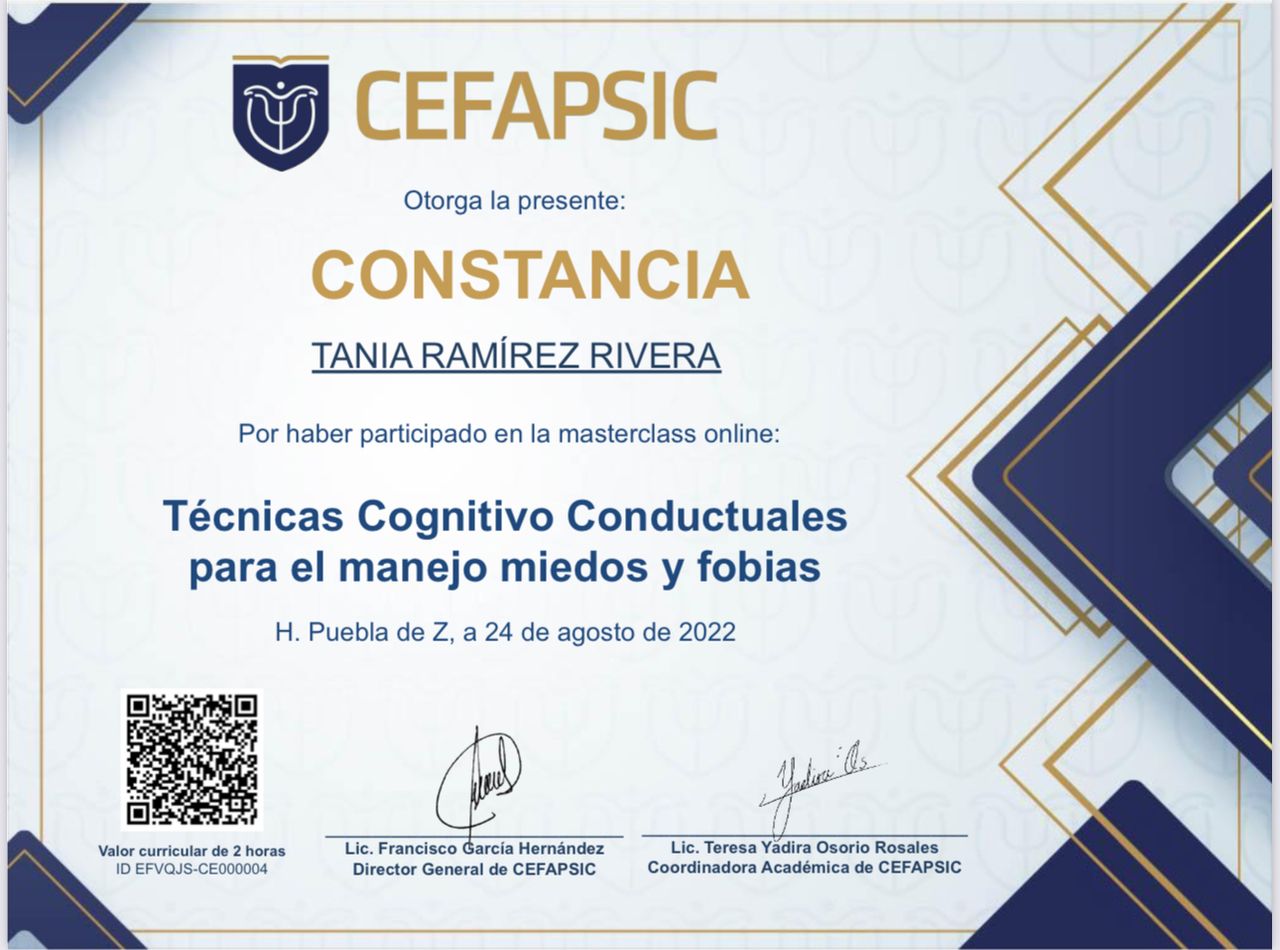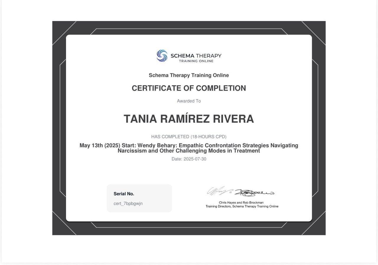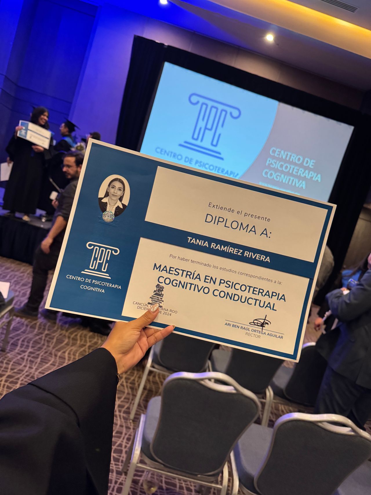 Soy psicóloga egresada de la Universidad Latinoamericana ULA, con una Especialidad en Psicología Clínica por el Centro Internacional de Estudios Superiores CIES y Maestra en Terapia Cognitivo Conductual desde Diciembre 2024, por el Centro de Psicoterapia Cognitiva de Cancún, la única institución en México avalada por "The Academy of Cognitive and Behavioral Therapies", actualmente me encuentro en proceso de Titulación, además cursé un Diplomado en Terapia de Esquemas, también en el Centro de Psicoterapia Cognitiva.