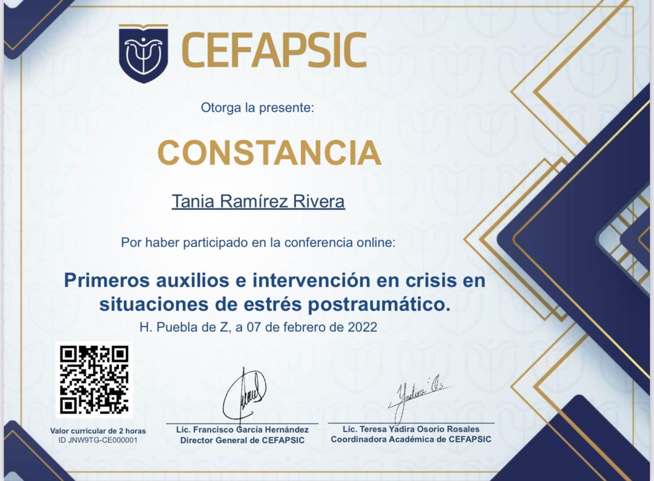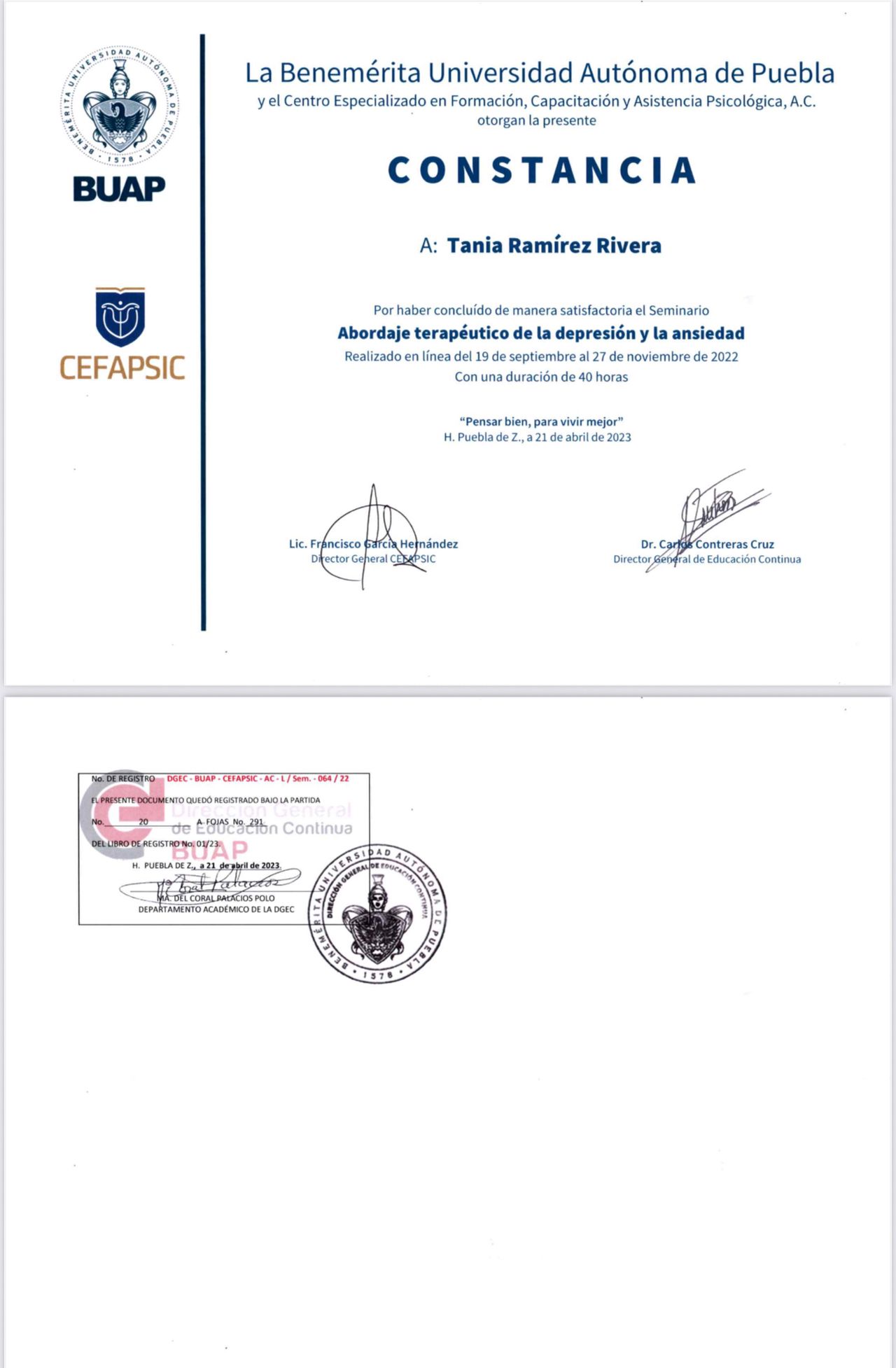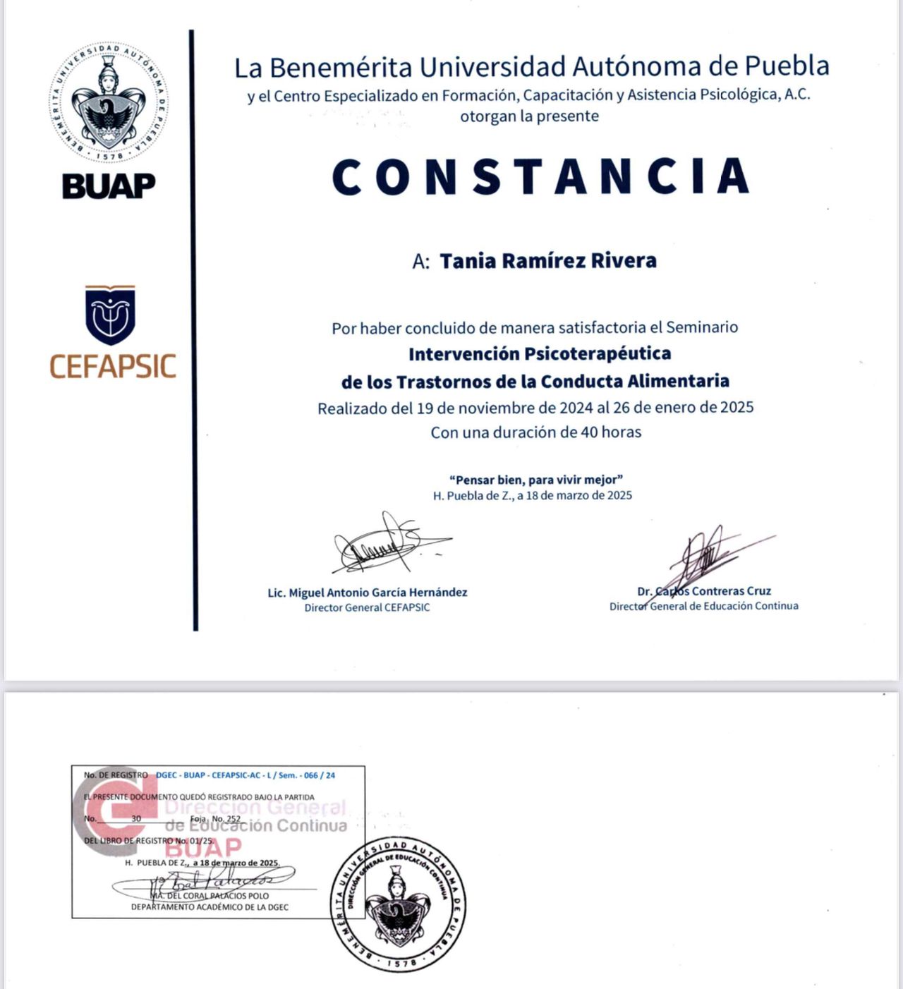 Soy psicóloga egresada de la Universidad Latinoamericana ULA, con una Especialidad en Psicología Clínica por el Centro Internacional de Estudios Superiores CIES y Maestra en Terapia Cognitivo Conductual desde Diciembre 2024, por el Centro de Psicoterapia Cognitiva de Cancún, la única institución en México avalada por "The Academy of Cognitive and Behavioral Therapies", actualmente me encuentro en proceso de Titulación, además cursé un Diplomado en Terapia de Esquemas, también en el Centro de Psicoterapia Cognitiva.