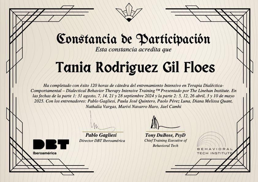 El enfoque terapéutico que ofrezco integra herramientas basadas en evidencia. A través de ACT y DBT, acompaño en el desarrollo de habilidades para comprender la experiencia interna, regular las emociones, fortalecer la flexibilidad psicológica y avanzar hacia una vida alineada con tus propios valores y que disfrutes vivir, por otro lad, el método Parcuve me permite abordar de manera cuidadosa y progresiva las huellas del trauma, favoreciendo procesos seguros de integración y recuperación.