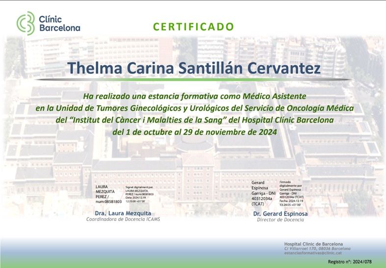 Durante mi formación adquirí una sólida preparación clínica y académica, orientada a la prevención, diagnóstico, tratamiento (con quimioterapia, hormonoterapia, inmunoterapia y terapia blanco) y seguimiento integral de pacientes con cáncer, bajo los más altos estándares de calidad médica.