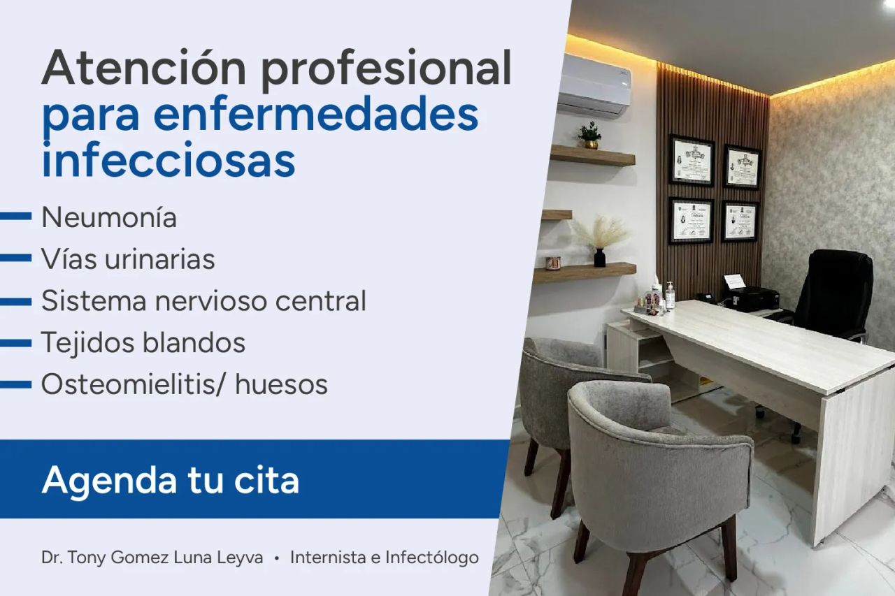 Hola, soy el Dr. Tony Gómez Luna Leyva, Internista e Infectólogo titulado por la Universidad de Guadalajara. Realicé Medicina Interna en el Antiguo Hospital Civil “Fray Antonio Alcalde” y después me especialicé en Infectología en la misma universidad, convencido de que cada paciente merece una atención médica sólida, profesional y compasiva.