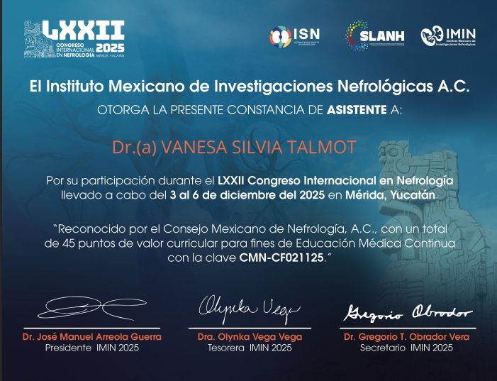 Soy la Dra. Vanesa S. Talmot, Nefróloga con más de 19 años de experiencia en la atención del paciente adulto. Realicé mis estudios en Argentina, mi país natal, donde cursé la Carrera de Medicina, la Especialidad en Medicina Interna y posteriormente la Especialidad en Nefrología en la Universidad Nacional de Rosario. En 2016, decidí radicar en México, donde obtuve la revalidación de mis títulos por la Secretaría de Educación Pública. Aprobé exitosamente el examen del Consejo Mexicano de Nefrología, logrando mi Certificación en 2017. He trabajado como Médica Nefróloga en el Instituto de Seguridad y Servicios Sociales de los Trabajadores del Estado (ISSSTE) de la ciudad de Cancún desde 2017 hasta marzo de 2024. Durante mi trayectoria profesional, he adquirido una amplia experiencia en el diagnóstico y tratamiento de diversas enfermedades renales, incluyendo la enfermedad renal diabética, una complicación frecuente en pacientes con diabetes mal controlada. Mi formación como nefróloga e internista me han permitido adquirir gran experiencia en manejo y control de paciente con diabetes tipo 2 entre muchos otros padecimientos. Mi enfoque en la atención médica se basa en brindar consultas con dedicación, sin prisas, otorgando el tiempo necesario que cada caso amerita, siempre con empatía, profesionalismo y calidez. Si tienes dudas acerca de tu salud renal, agenda una cita conmigo; estaré encantada de ayudarte.