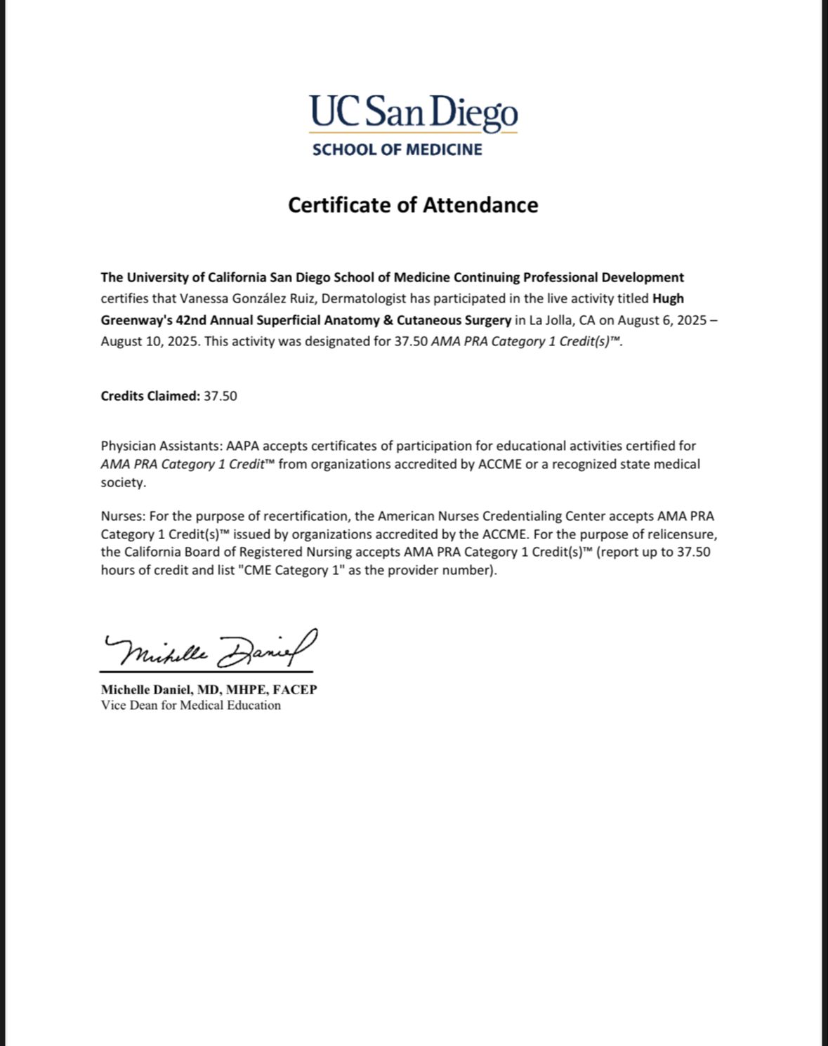 Excelente atención. La dermatóloga fue puntual y muy profesional. Explica claramente el diagnóstico, no es alarmista y ofrece diferentes alternativas de tratamiento. Además, no intenta vender productos con precios elevados, lo cual se agradece. Sin duda, una atención honesta y confiable.