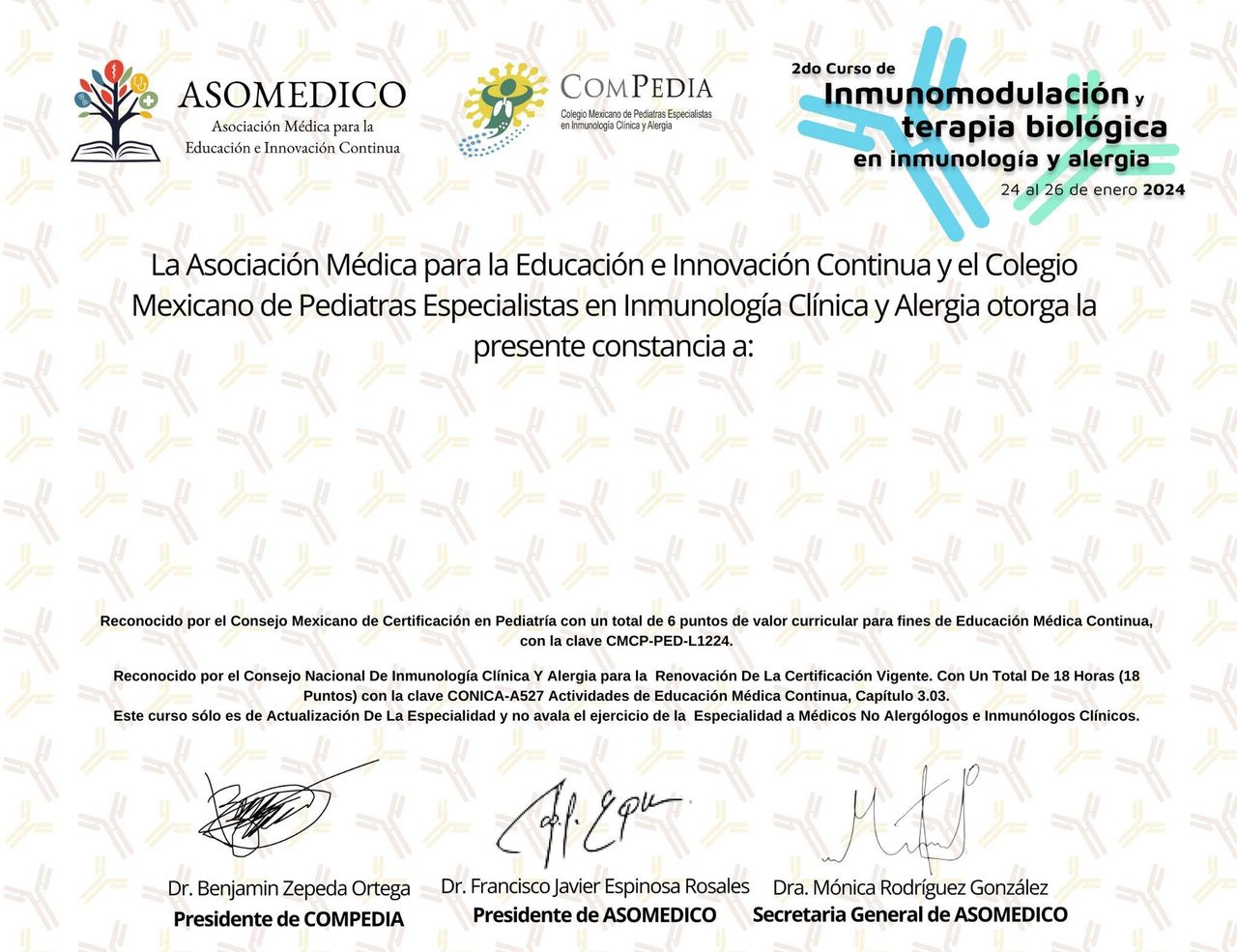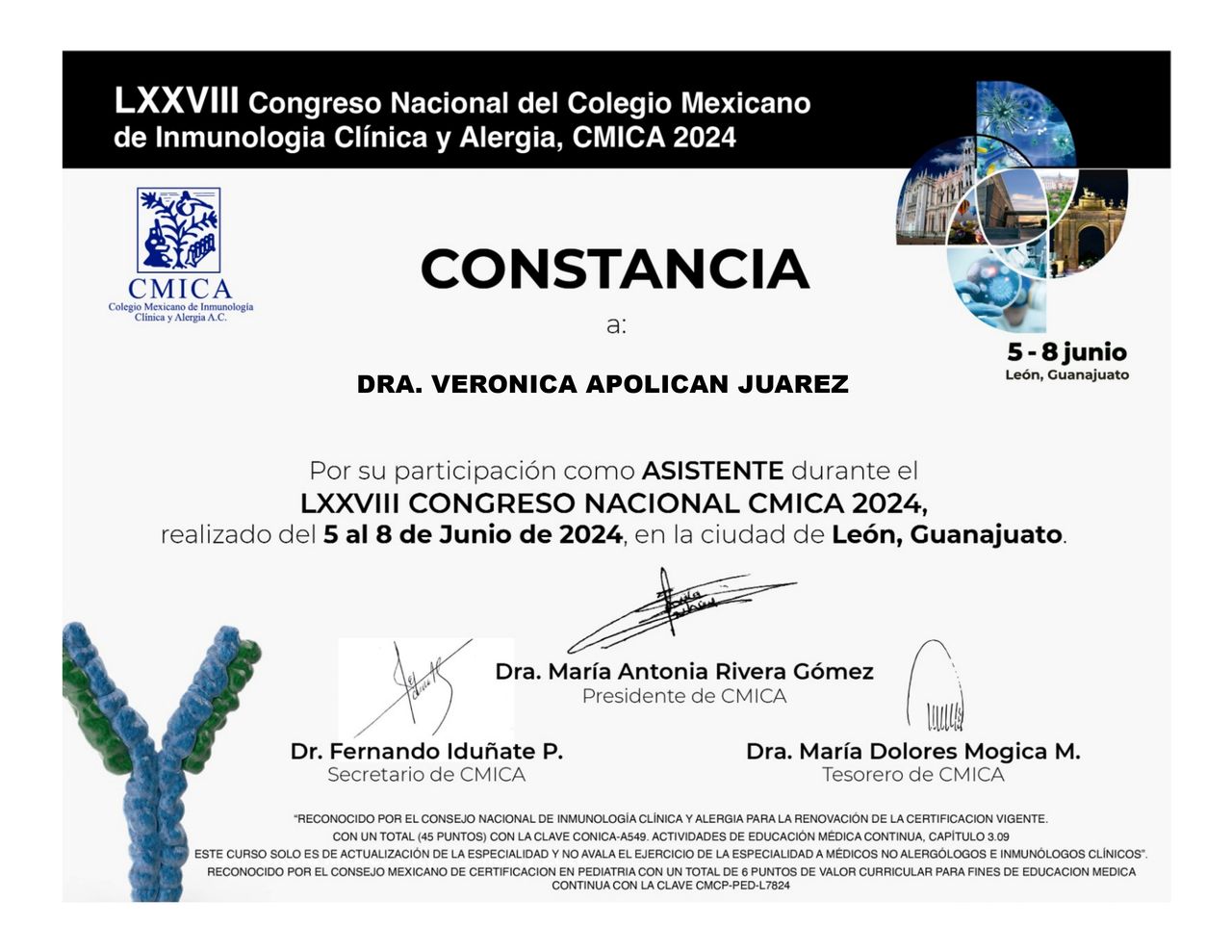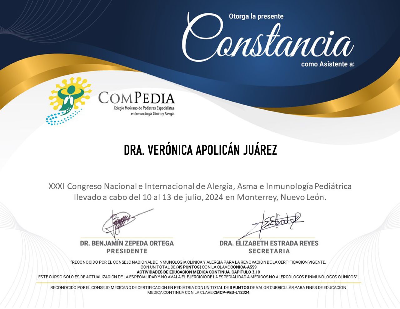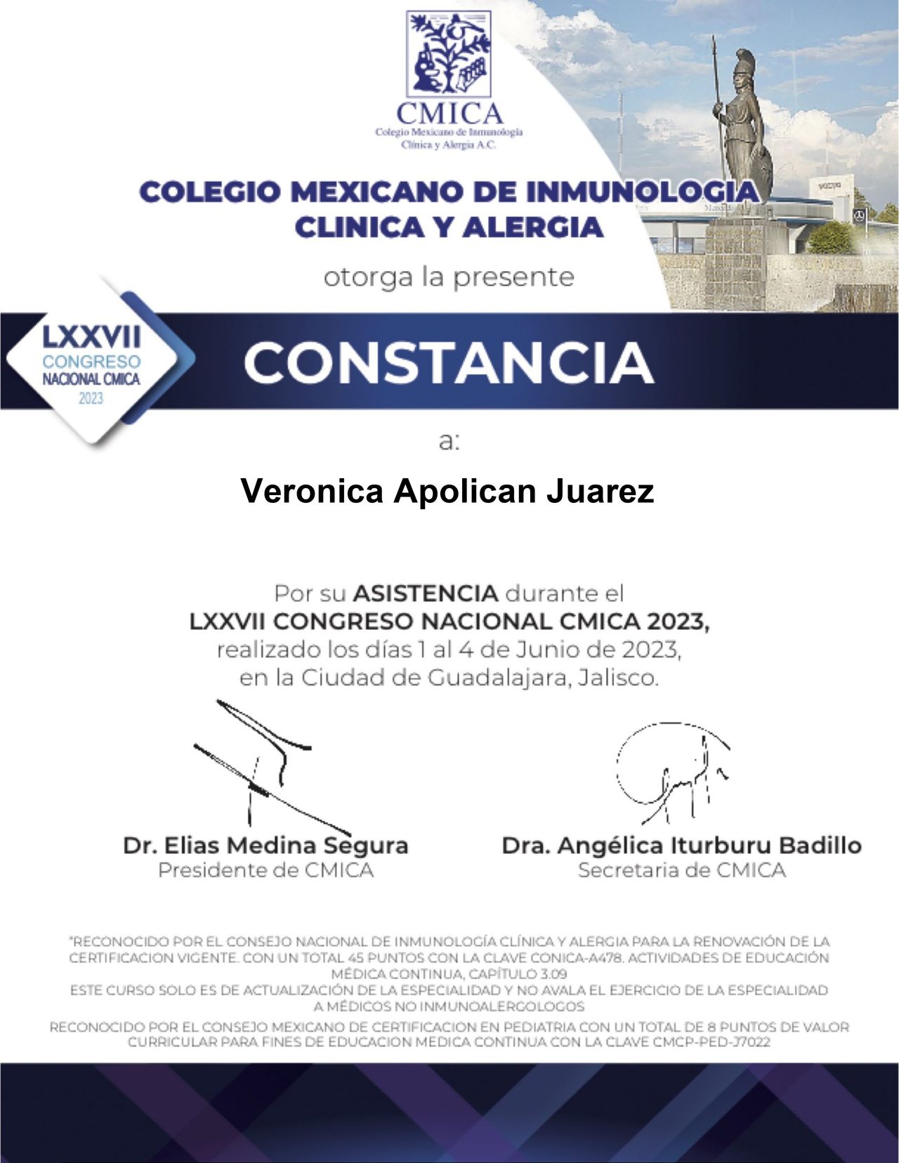 Estoy certificada por el Consejo Nacional de Inmunología Clínica y Alergia (CONICA) y soy miembro activo del Colegio Mexicano de Inmunología Clínica y Alergia (CMICA).