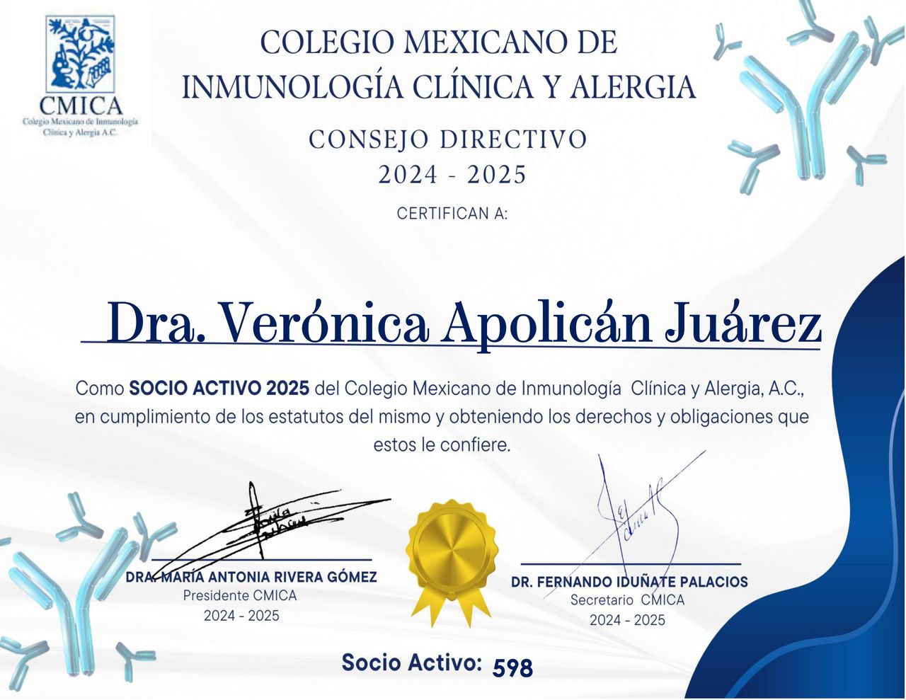 Hola, soy la Dra. Verónica Apolicán Juárez, especialista en Alergia e Inmunología Clínica, egresada del Hospital General de México “Dr. Eduardo Liceaga”, una de las instituciones más reconocidas del país en la formación médica.