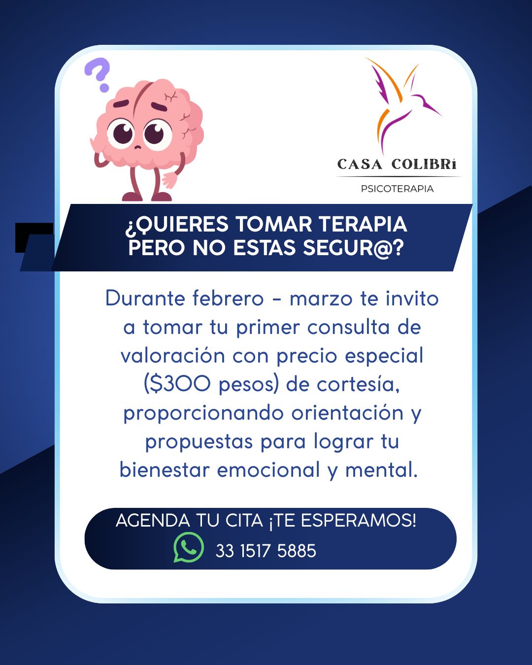 Durante febrero y marzo te invito a tomar tu primer consulta de valoración con precio especial ($300 pesos) de cortesía proporcionando orientación y propuestas para tu bienestar emocional y mental. La cortesía aplica para adolescentes y adultos.