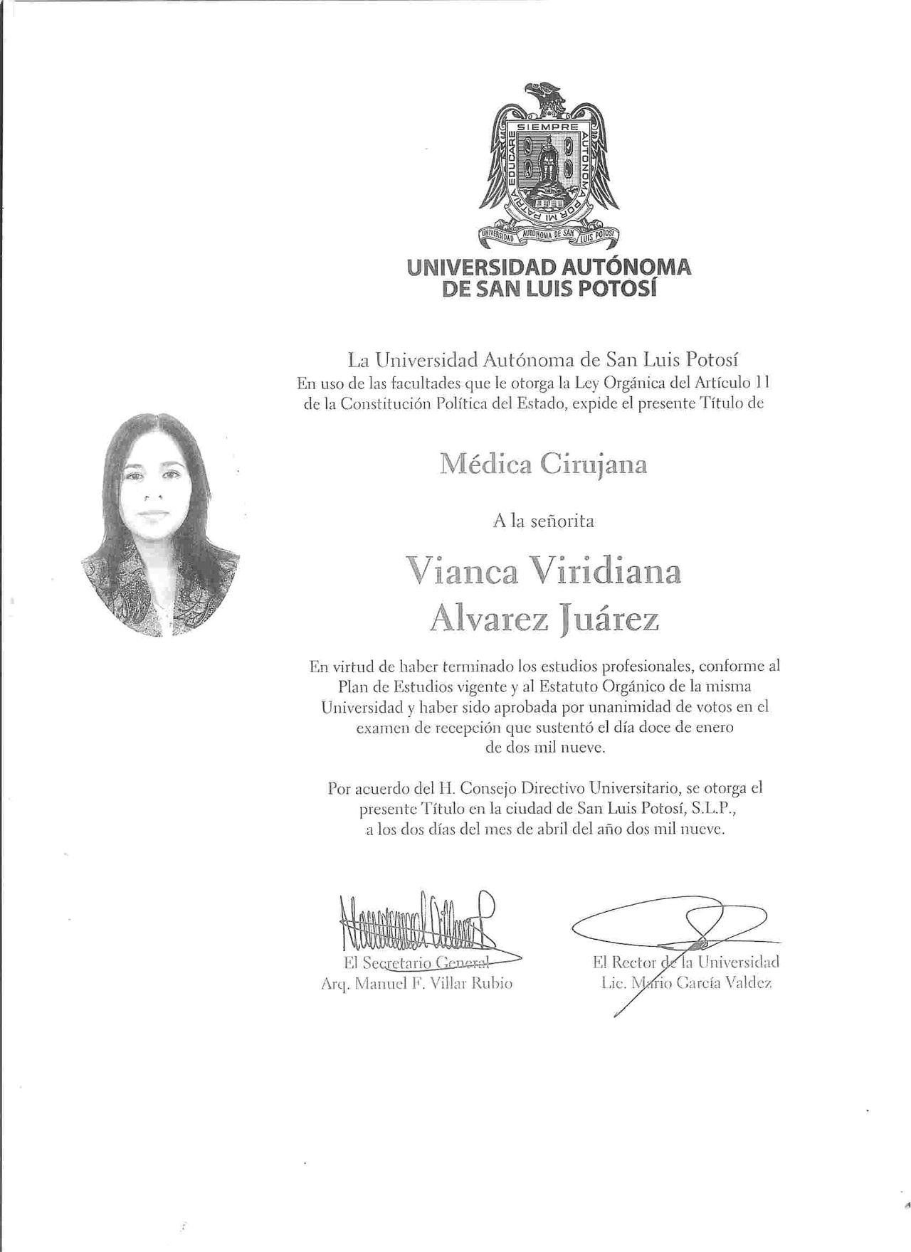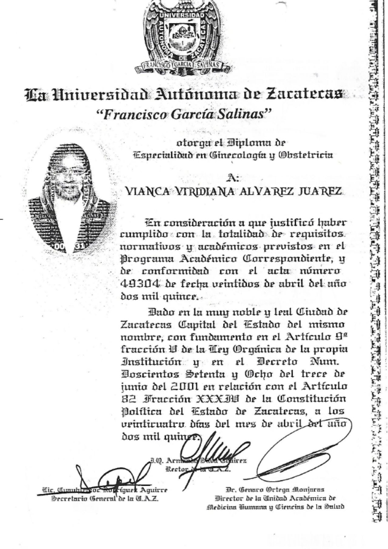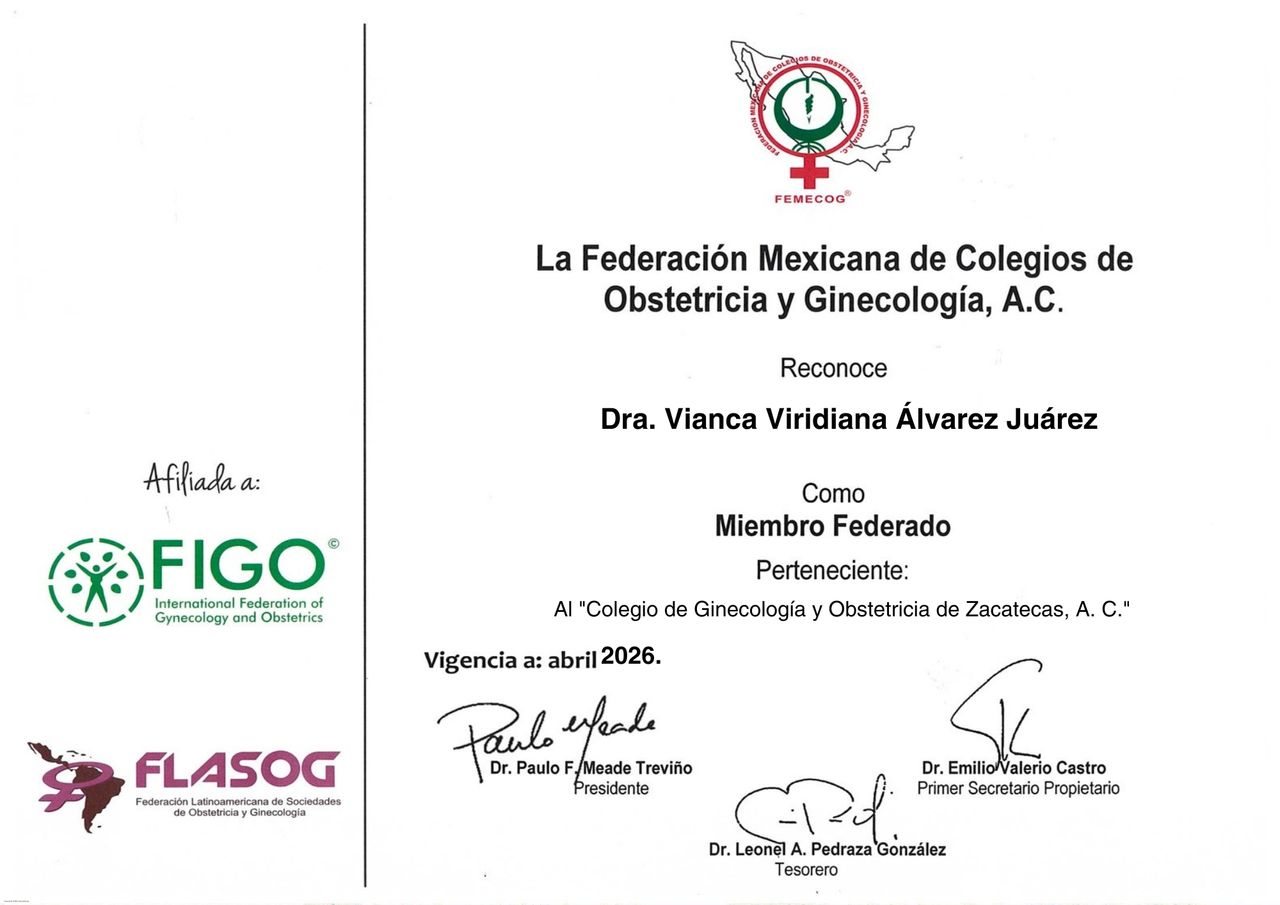 Con la Dra. Vianca Viridiana Álvarez Juárez, estás en manos de una especialista preparada para resolver tus necesidades de salud con empatía y competencia. Bienvenidos al Consultorio de Ginecología y Obstetricia VAJ, donde la salud femenina es nuestra prioridad. Ubicados en el Hospital Santa Fe Bernárdez en Guadalupe, Zacatecas, te ofrecemos una atención profesional y humana. Tesorera del Colegio de Ginecología y Obstetricia de Zacatecas. Miembro del Colegio Mexicano de Ginecología y Obstetricia. Miembro de Federación Mexicana de Colegios de Obstetricia y Ginecología. Certificada por el Consejo Mexicanode Ginecología y Obstetricia. Aviso de Publicidad 2432012002A00054