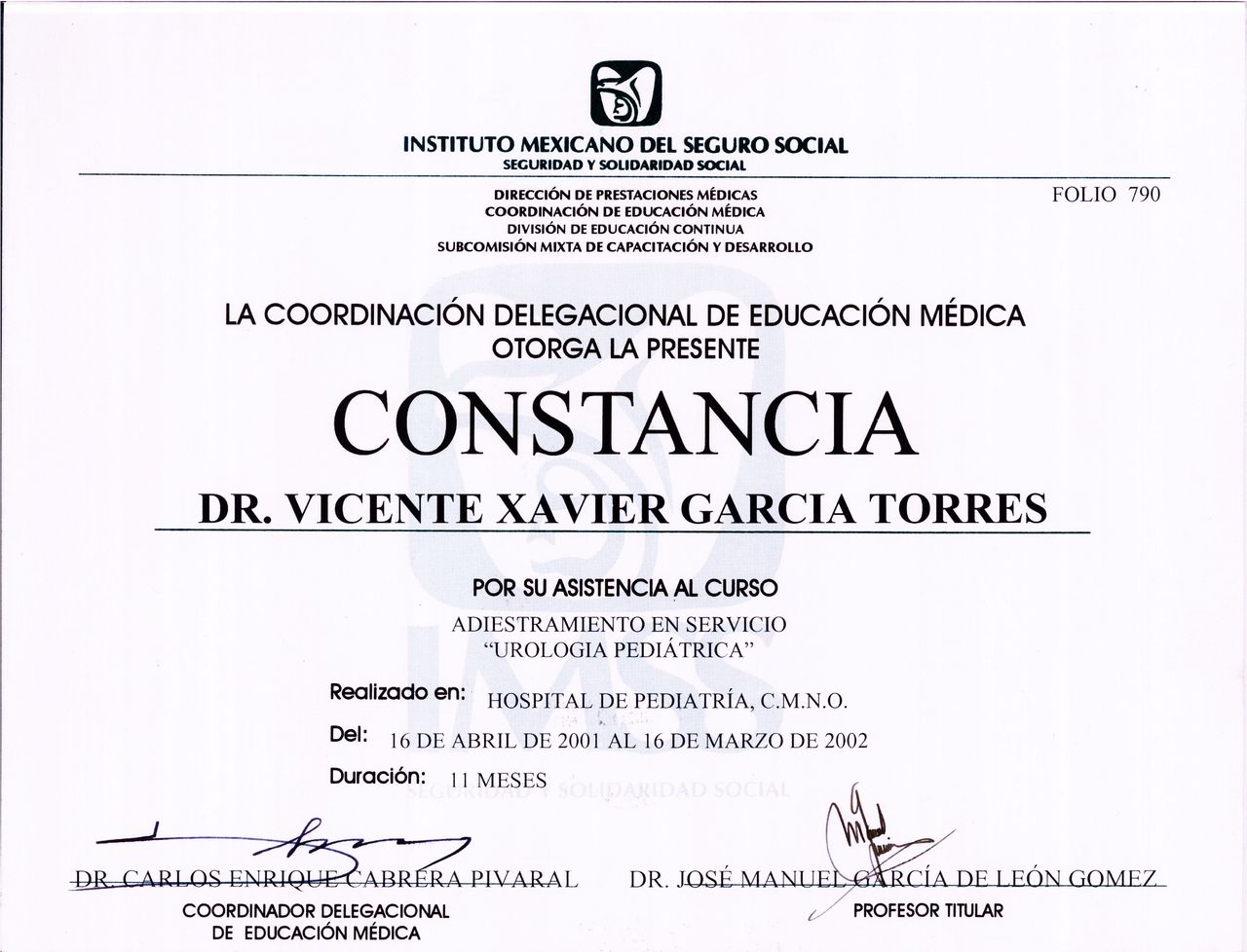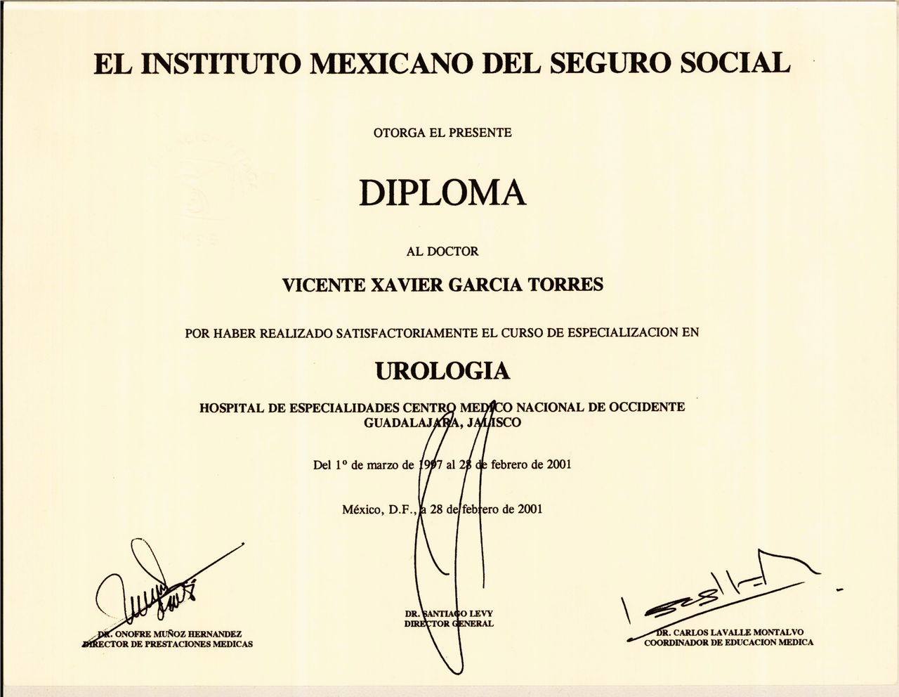 Formación académica como cirujano urólogo en el hospital de especialidades del centro médico nacional de occidente del instituto mexicano del seguro social.