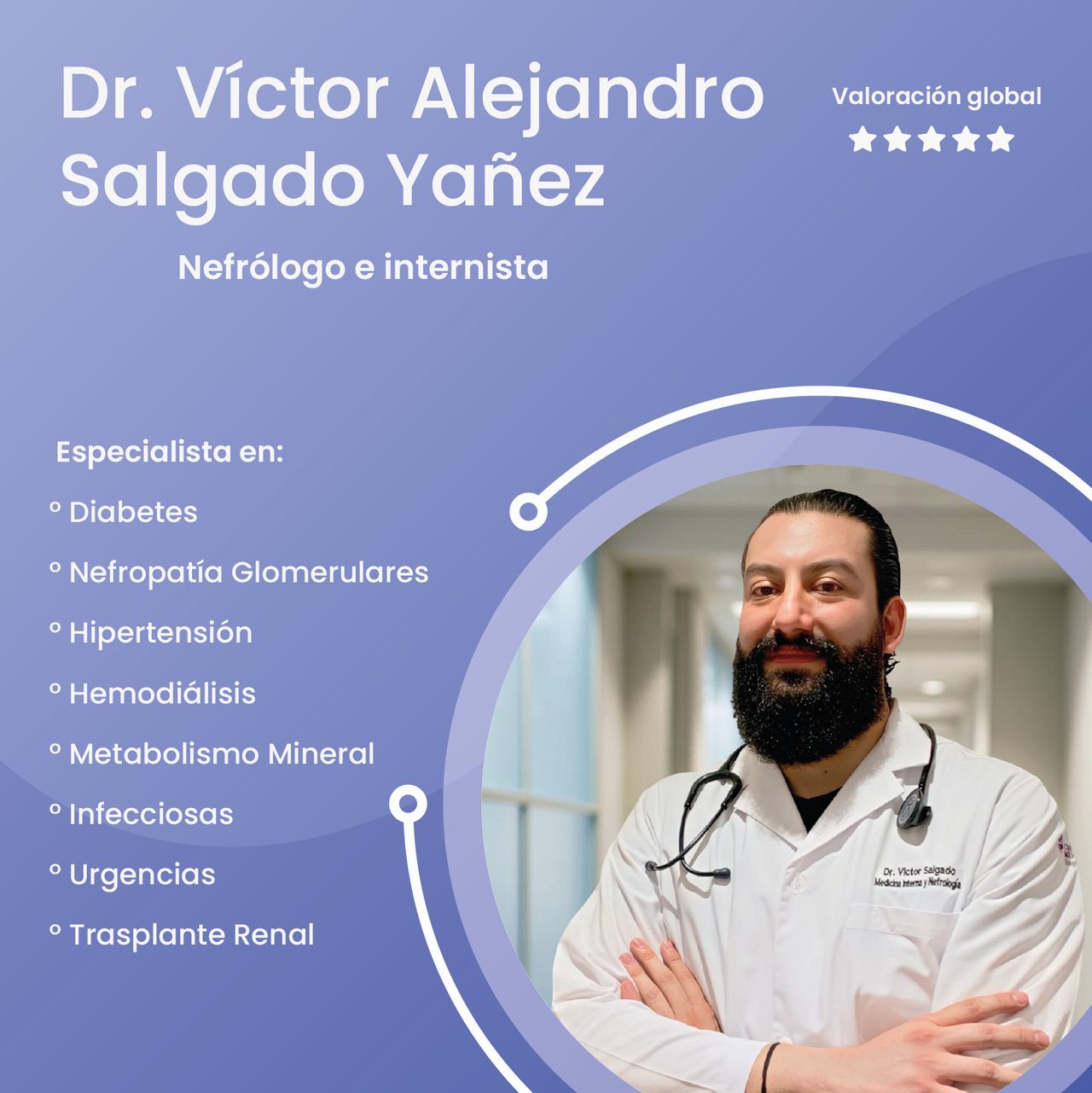 Soy el Dr. Víctor Salgado, Médico Internista y Nefrólogo. Mi compromiso es ofrecerte una atención integral, profesional y cercana. Especializado en los principales padecimientos cronicodegenerativos y en enfermedades renales, mi enfoque combina precisión diagnóstica y tratamiento eficaz. Porque tu salud merece un cuidado diferente, con experiencia y calidez. Tu bienestar es mi prioridad.