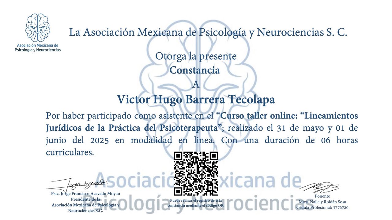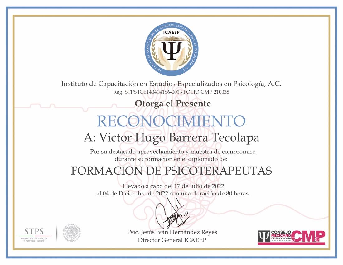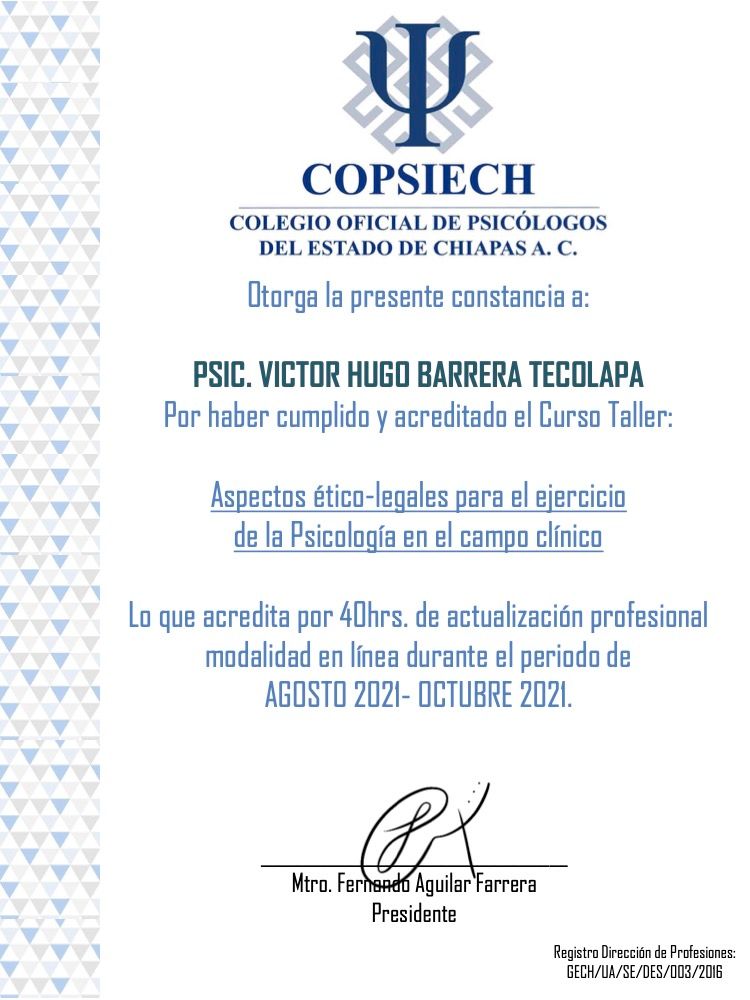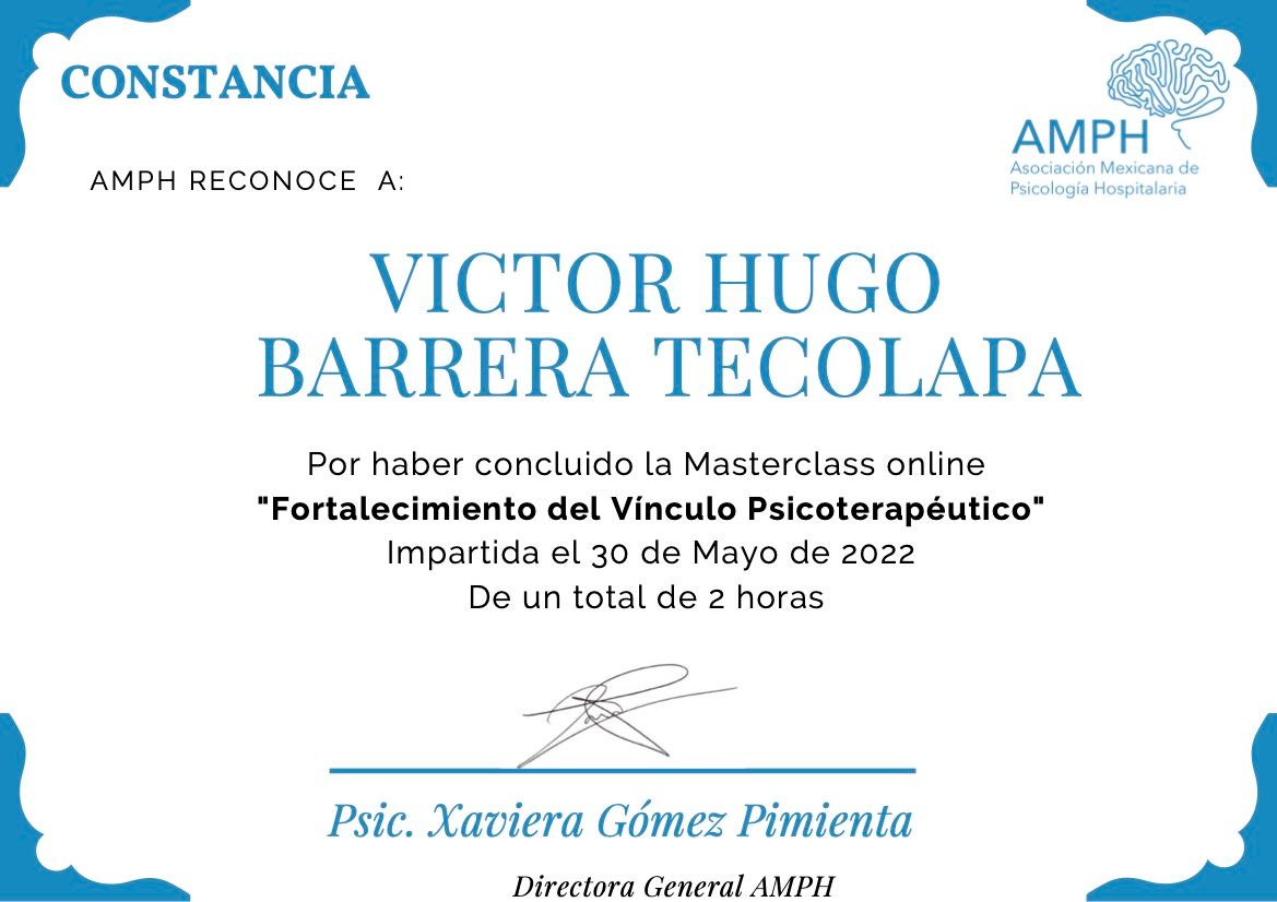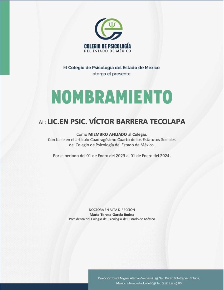Después de varios psicólogos, encontré al psicólogo Víctor Barrera, con quien me he sentido con plena confianza para hablar sobre mis problemas y emociones, me siento guiada apoyada y sobre todo segura de su ética profesional y de que me da las herramientas necesarias, estoy muy agradecida, y lo recomiendo al 100%.