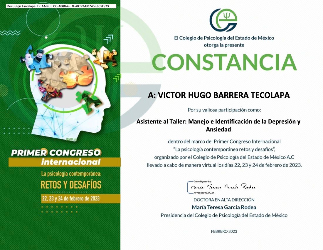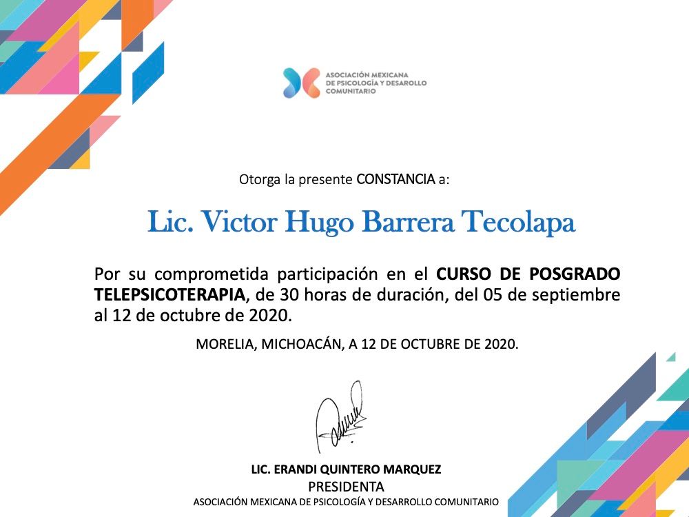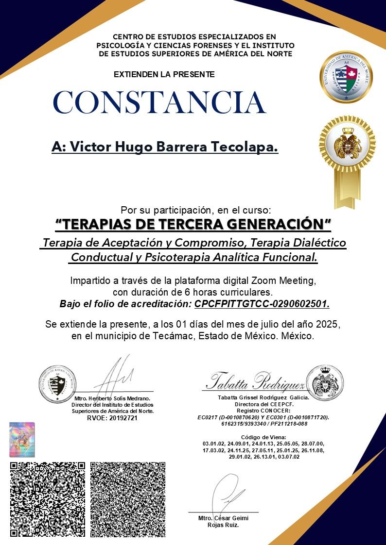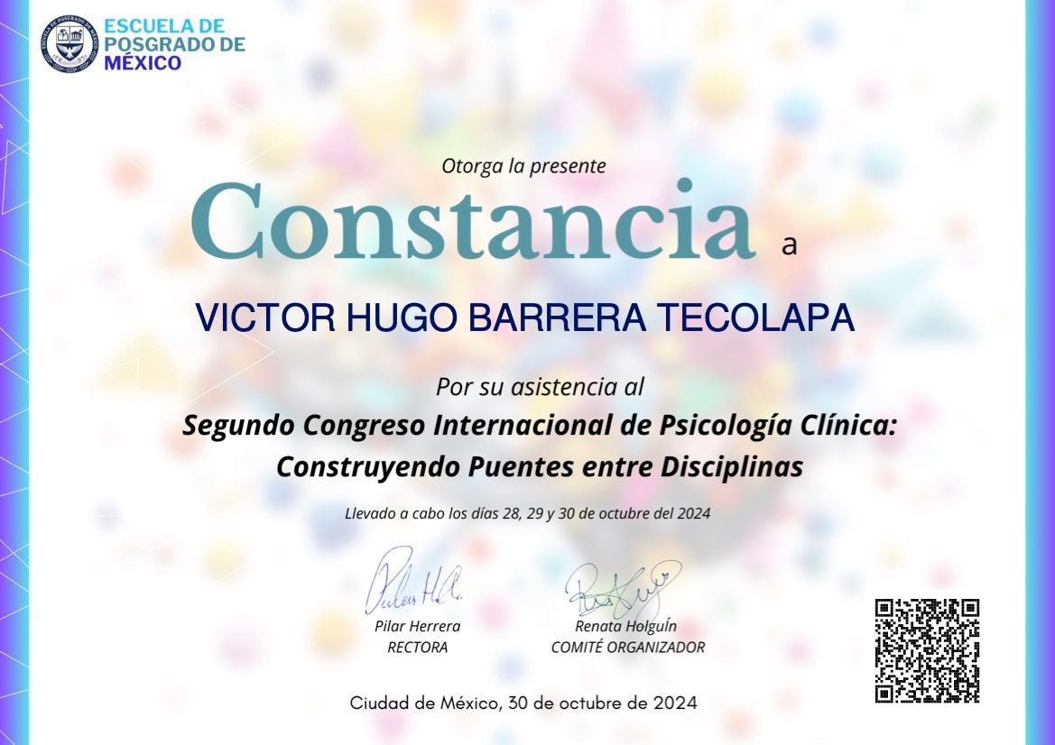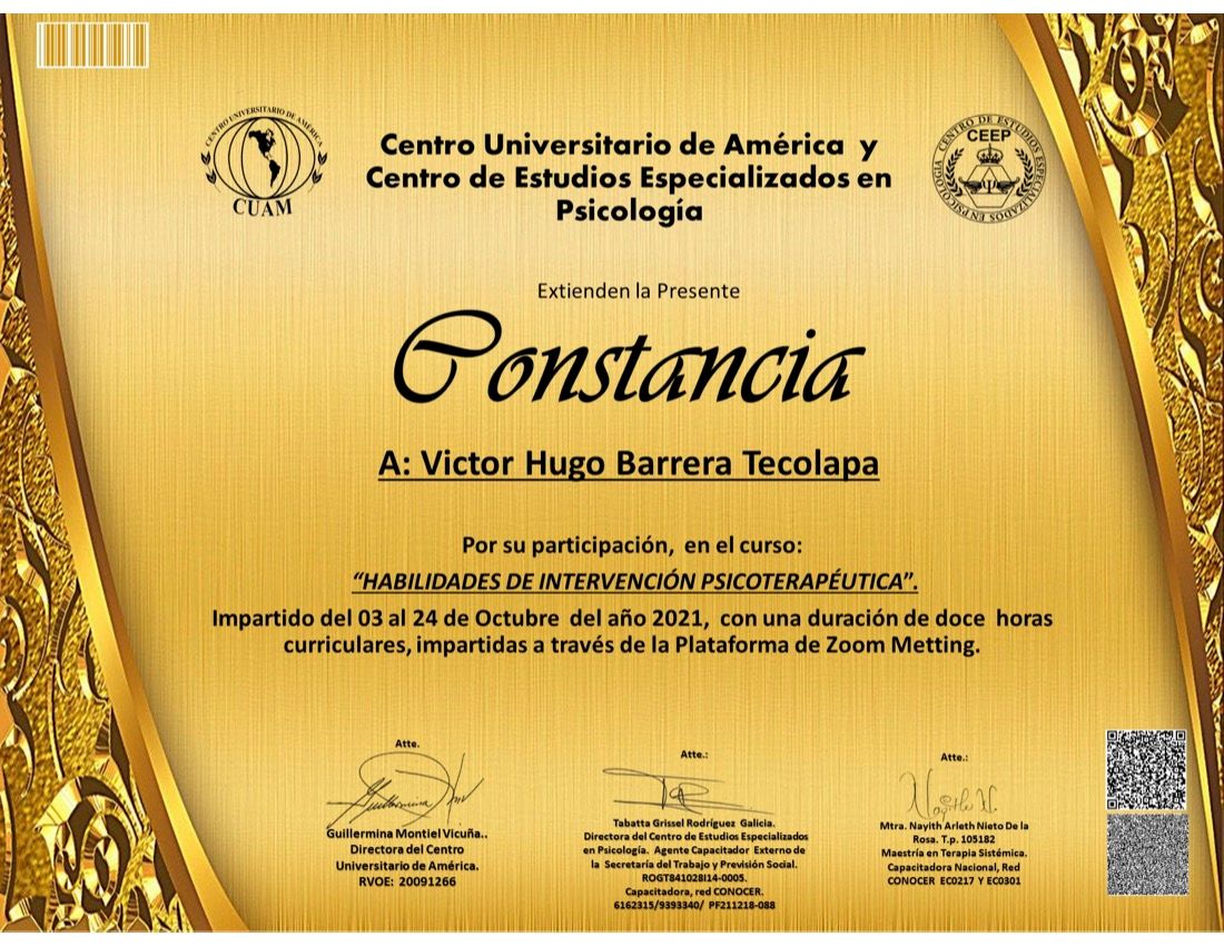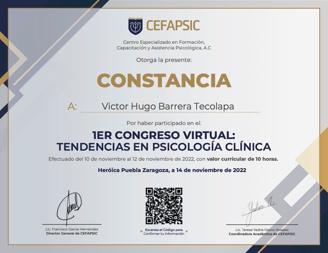 Después de varios psicólogos, encontré al psicólogo Víctor Barrera, con quien me he sentido con plena confianza para hablar sobre mis problemas y emociones, me siento guiada apoyada y sobre todo segura de su ética profesional y de que me da las herramientas necesarias, estoy muy agradecida, y lo recomiendo al 100%.