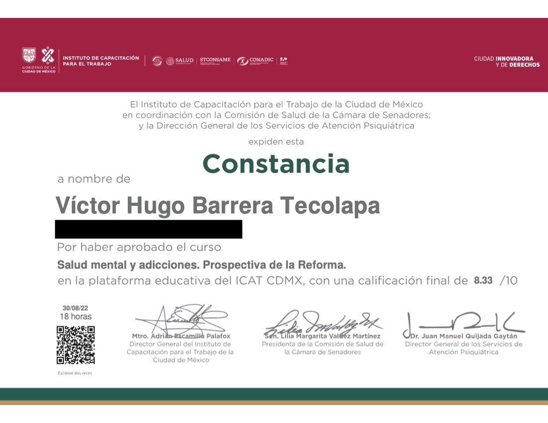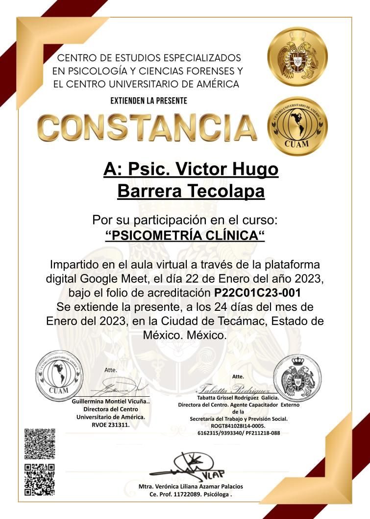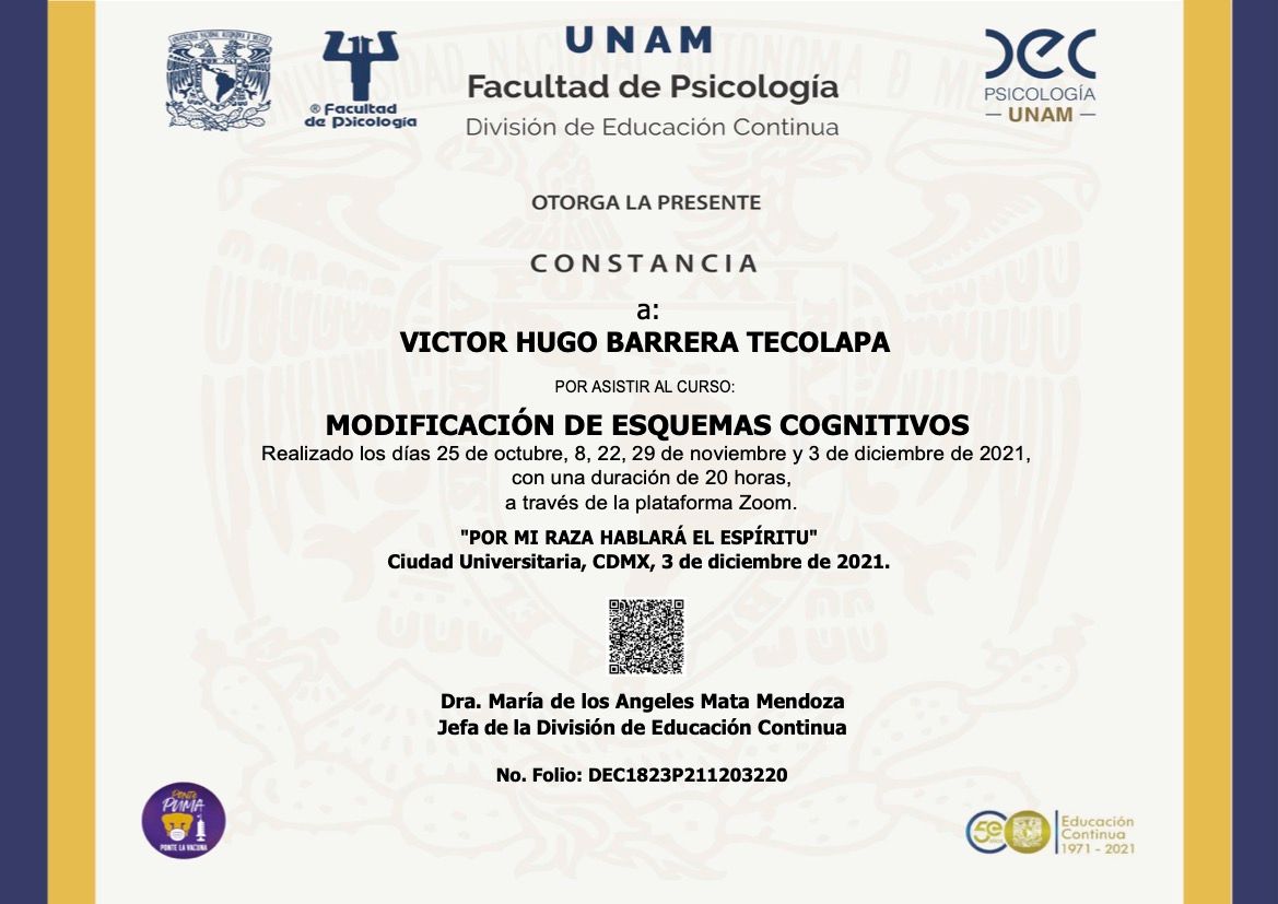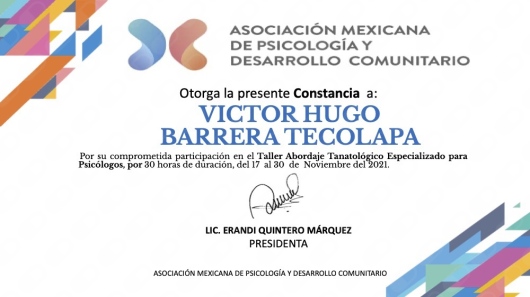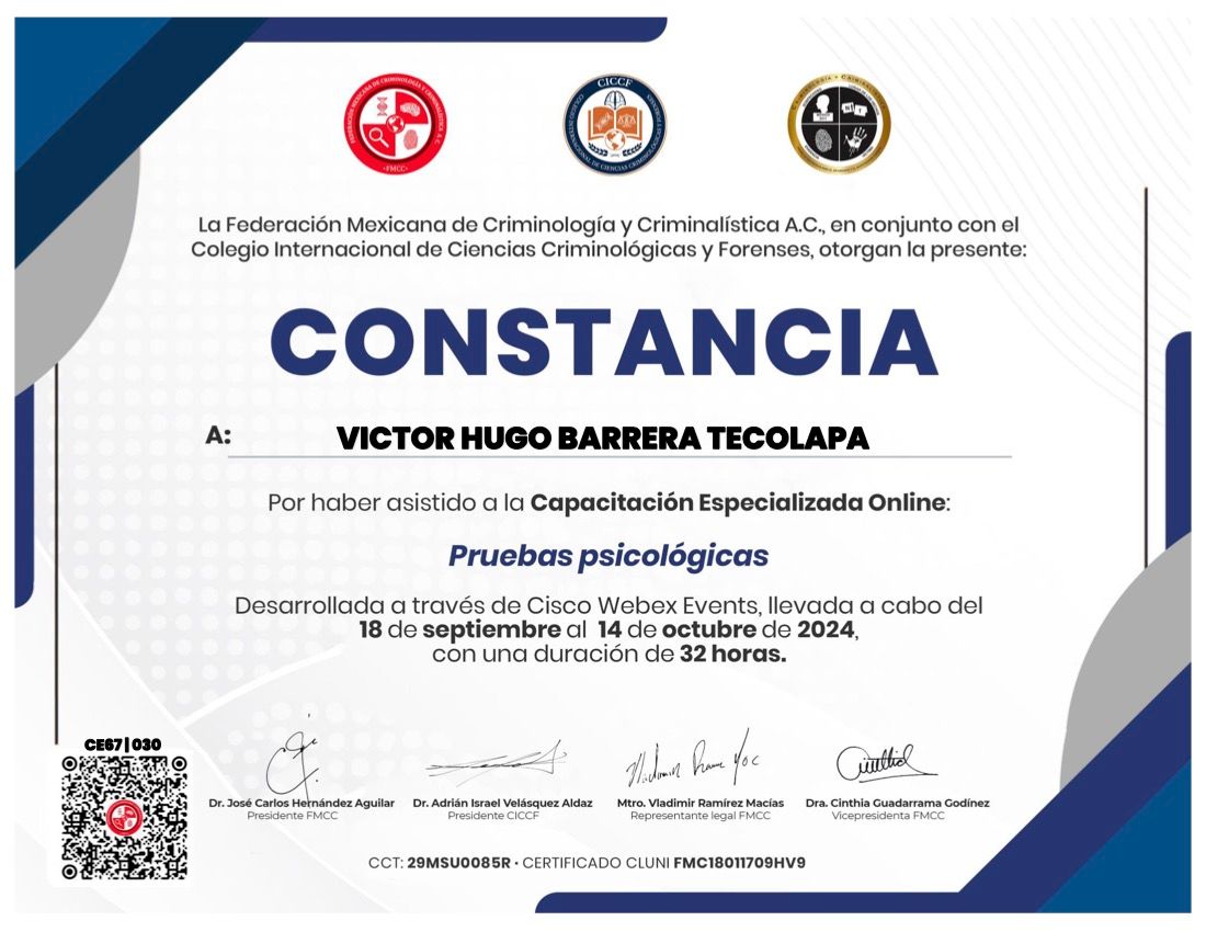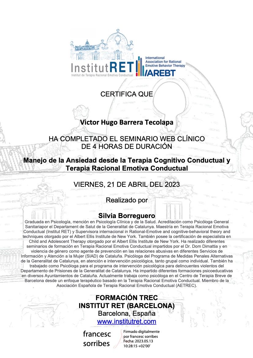 Después de varios psicólogos, encontré al psicólogo Víctor Barrera, con quien me he sentido con plena confianza para hablar sobre mis problemas y emociones, me siento guiada apoyada y sobre todo segura de su ética profesional y de que me da las herramientas necesarias, estoy muy agradecida, y lo recomiendo al 100%.