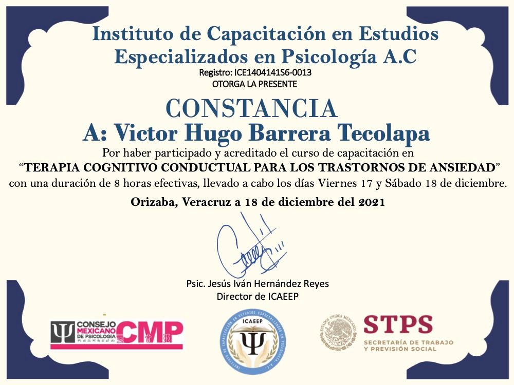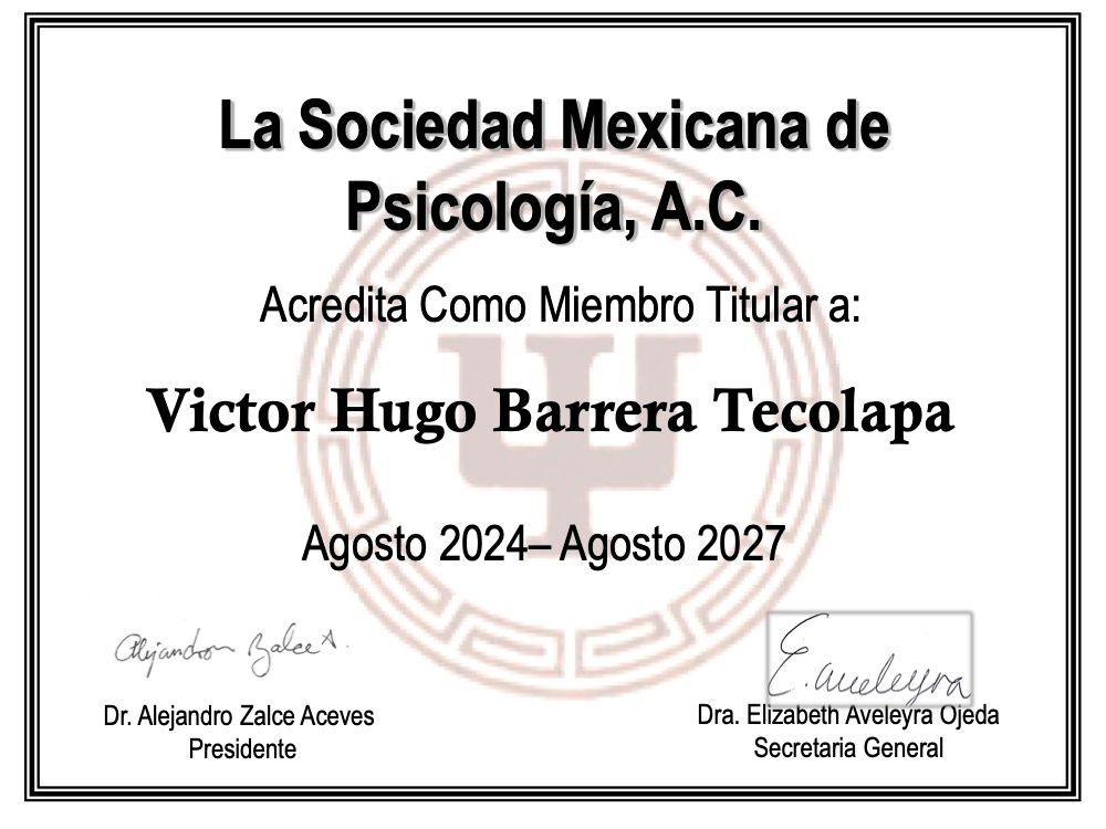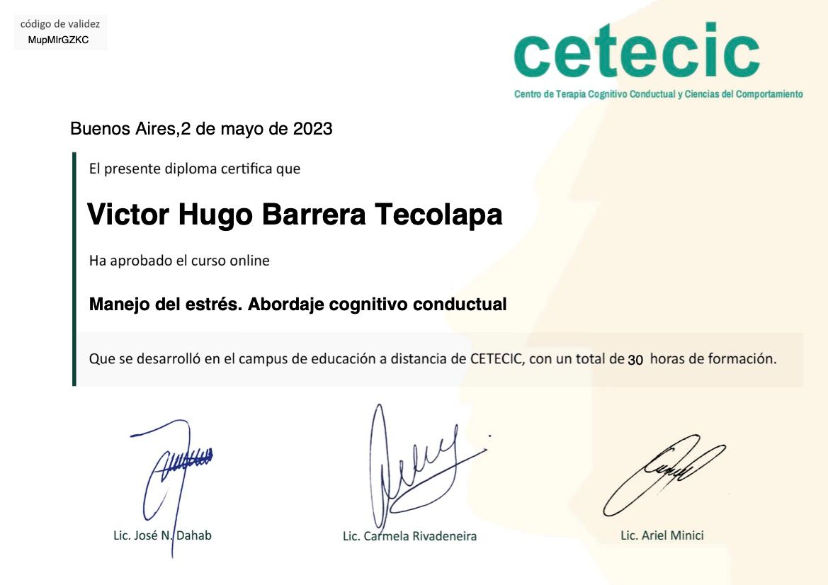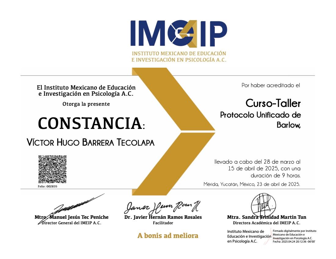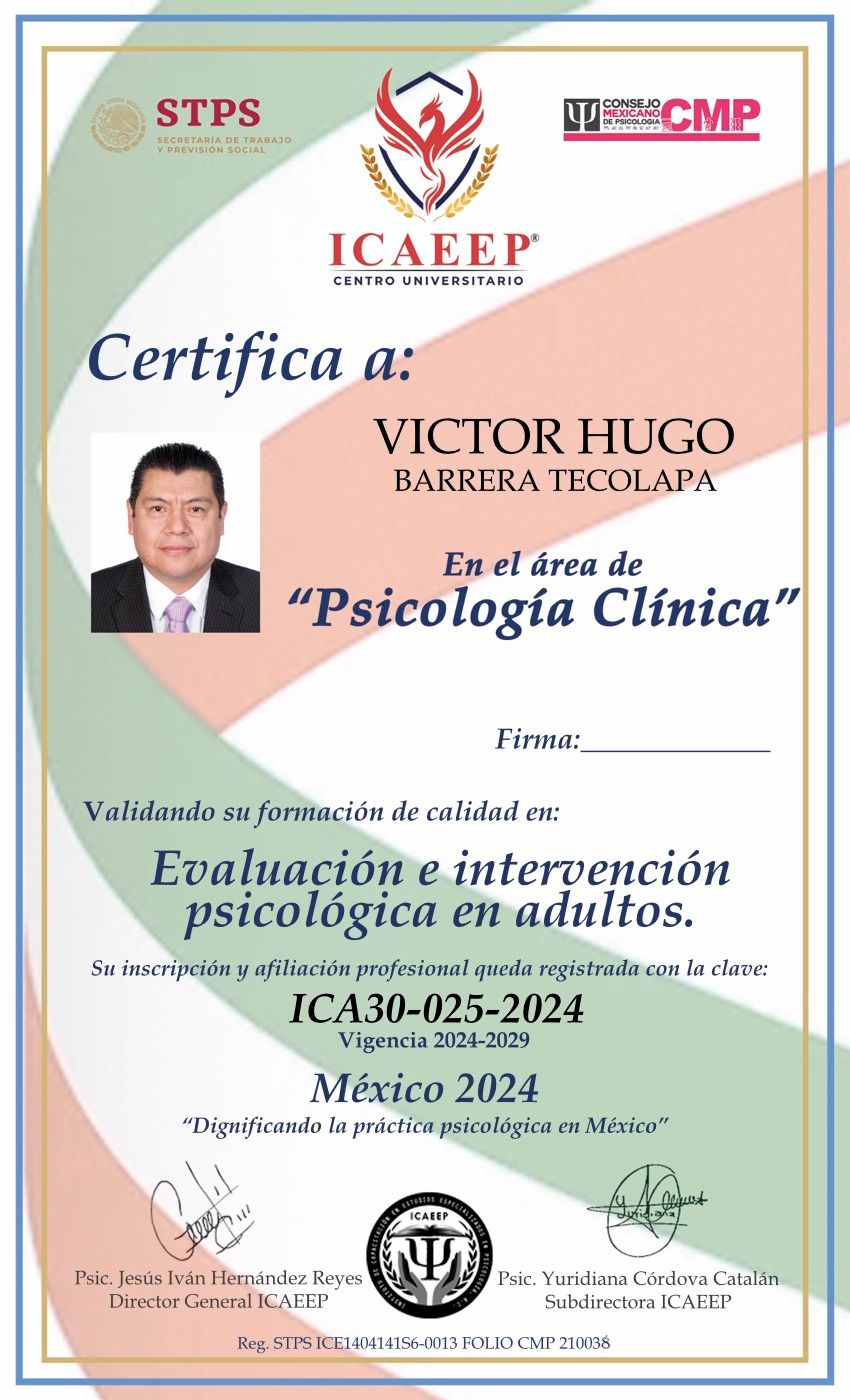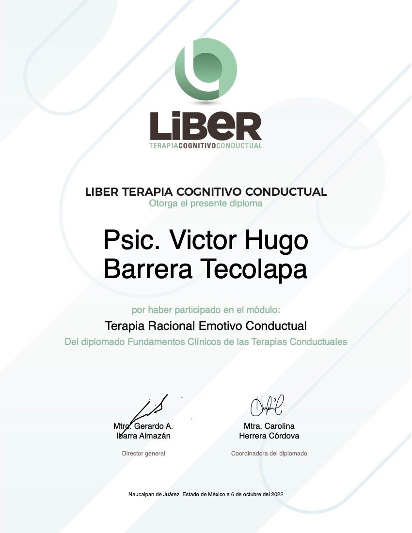 Hola, soy Victor Barrera, Psicólogo y Psicoterapeuta de adultos, mi modelo de intervención es el de la Terapia Cognitivo Conductual (TCC), he trabajado en el ámbito de la Salud Mental desde 2007. Me enfoco en provocar cambios mediante el tratamiento psicoterapéutico a través de la Terapia Cognitivo-Conductual. Me especializo en la evaluación, diagnóstico y tratamiento de la ansiedad, la depresión y el Trastorno de Estrés Postraumático (TEPT). Te ofrezco mi formación y experiencia profesional para modificar tu vida a través de la psicoterapia.