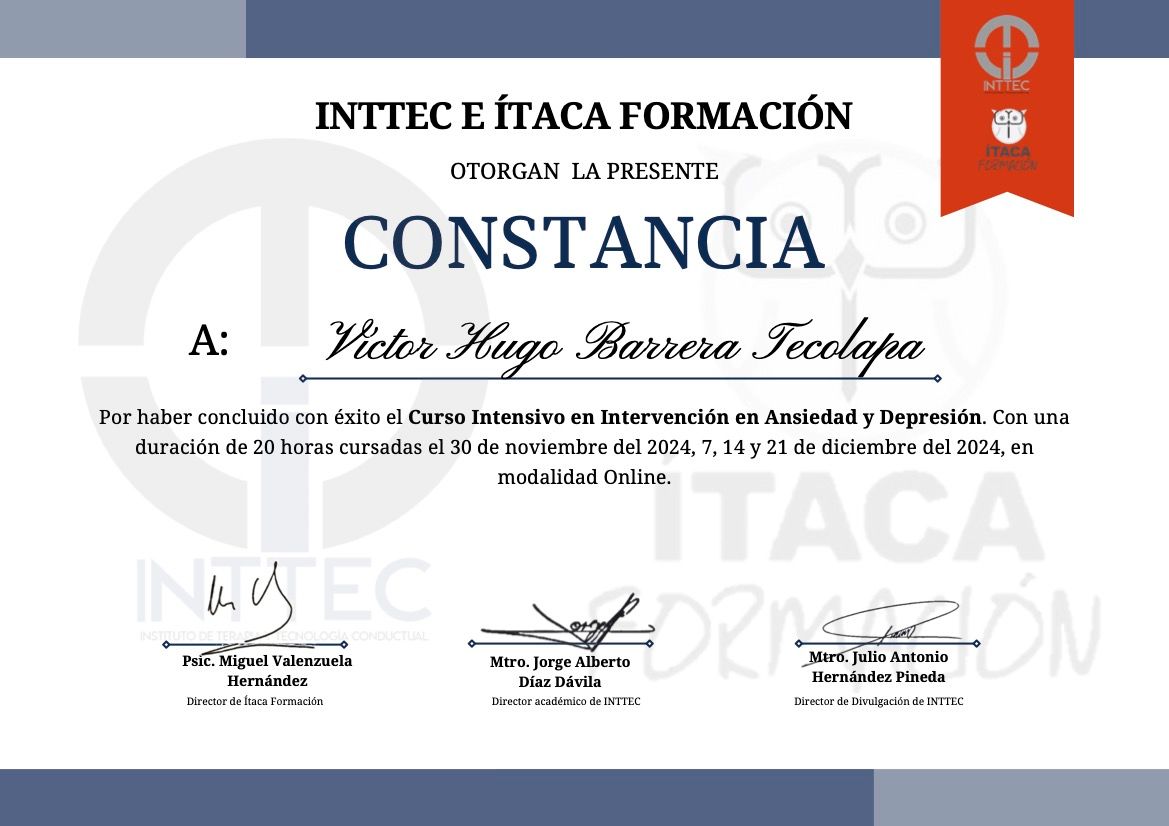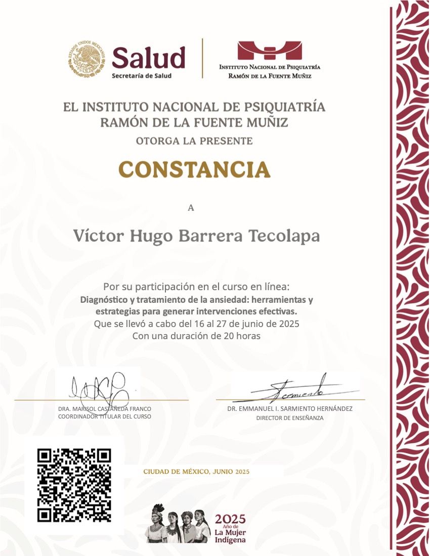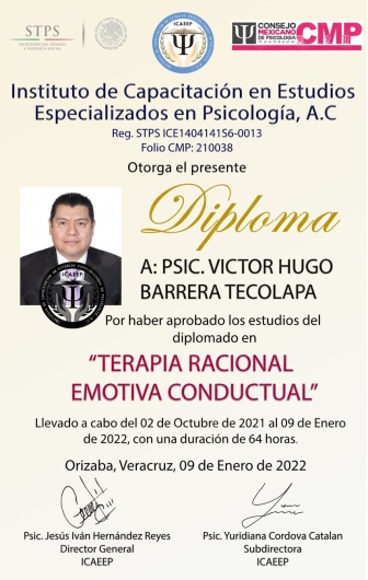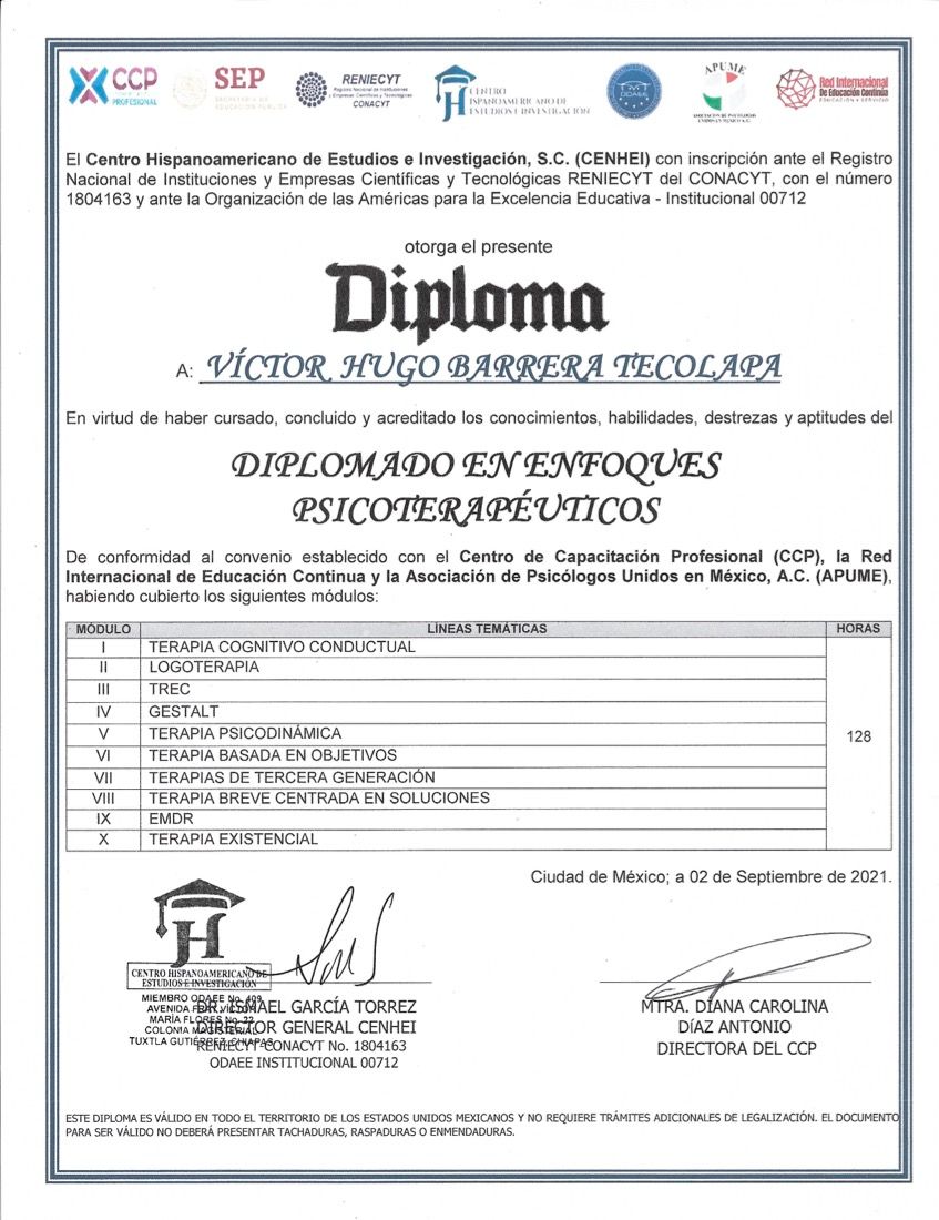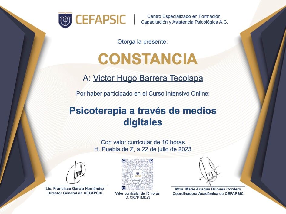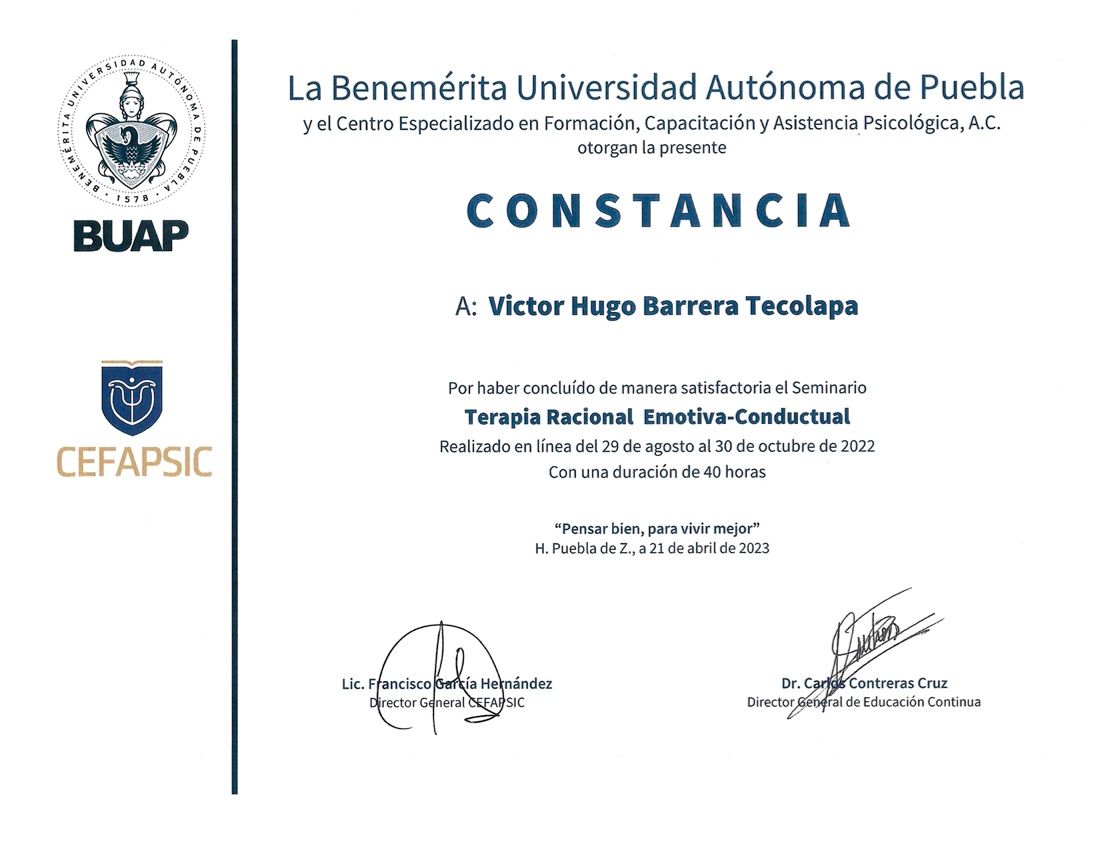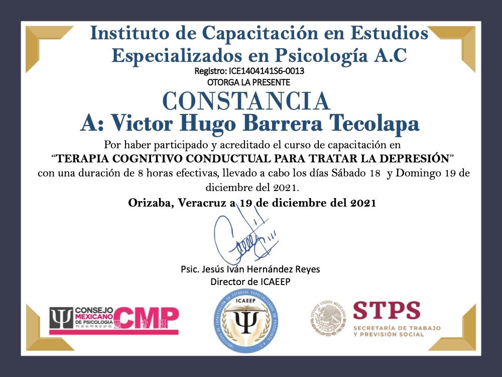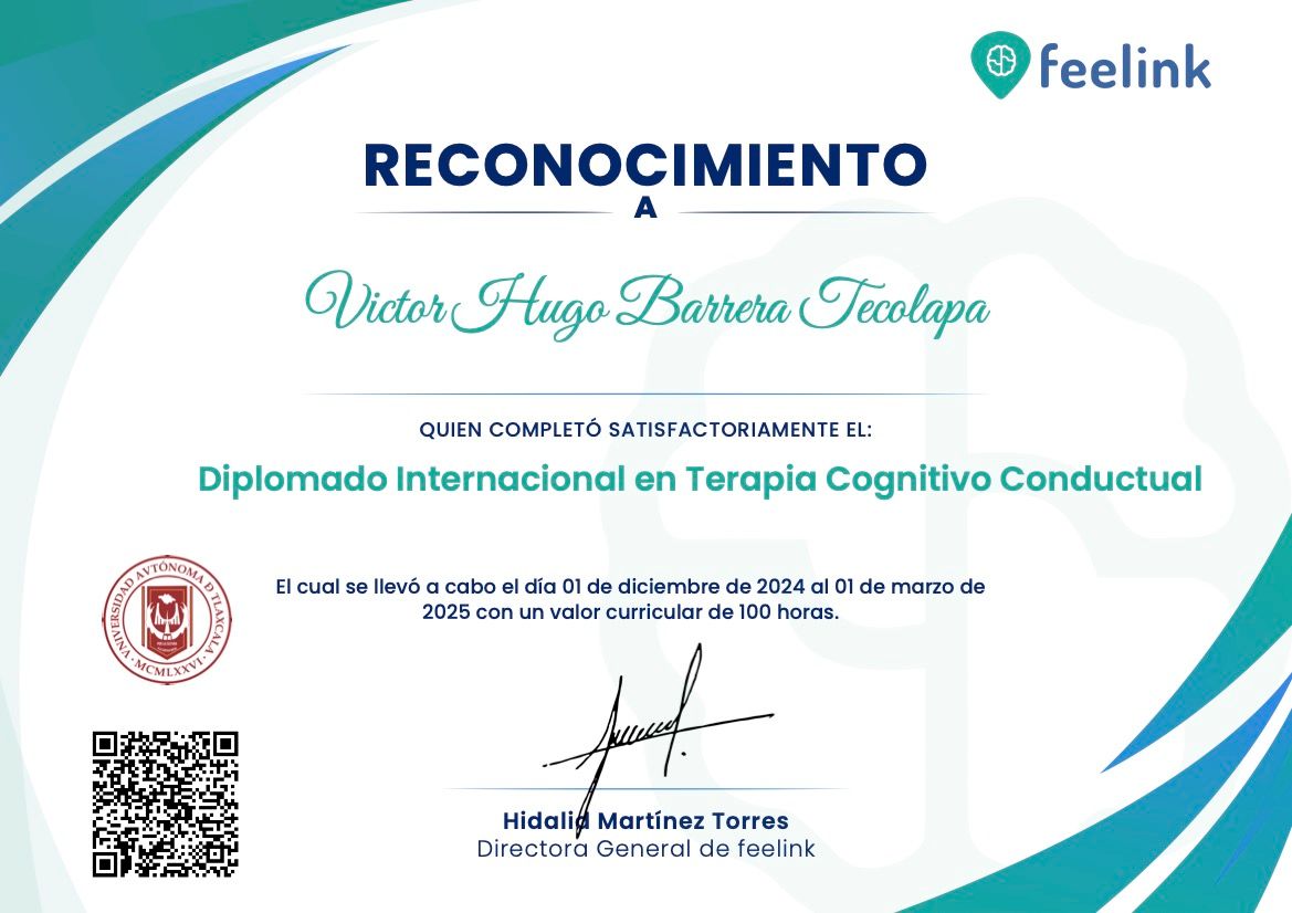Hola, soy Victor Barrera, Psicólogo y Psicoterapeuta de adultos, mi modelo de intervención es el de la Terapia Cognitivo Conductual (TCC), he trabajado en el ámbito de la Salud Mental desde 2007. Me enfoco en provocar cambios mediante el tratamiento psicoterapéutico a través de la Terapia Cognitivo-Conductual. Me especializo en la evaluación, diagnóstico y tratamiento de la ansiedad, la depresión y el Trastorno de Estrés Postraumático (TEPT). Te ofrezco mi formación y experiencia profesional para modificar tu vida a través de la psicoterapia.