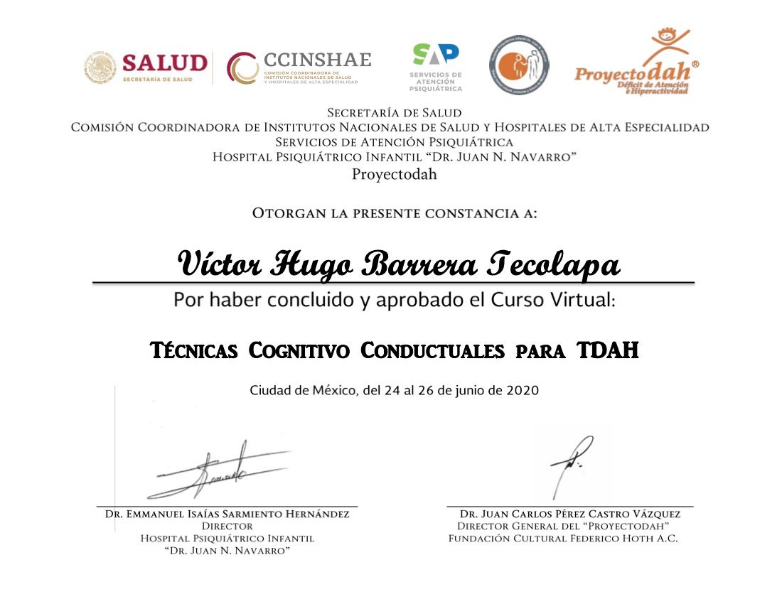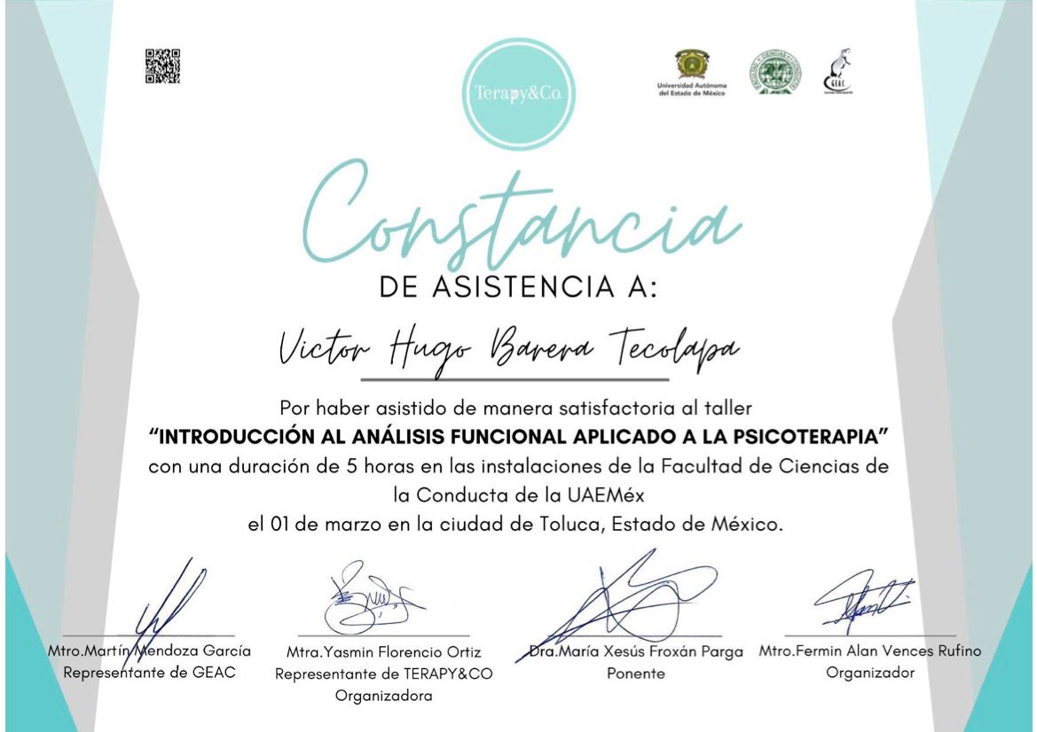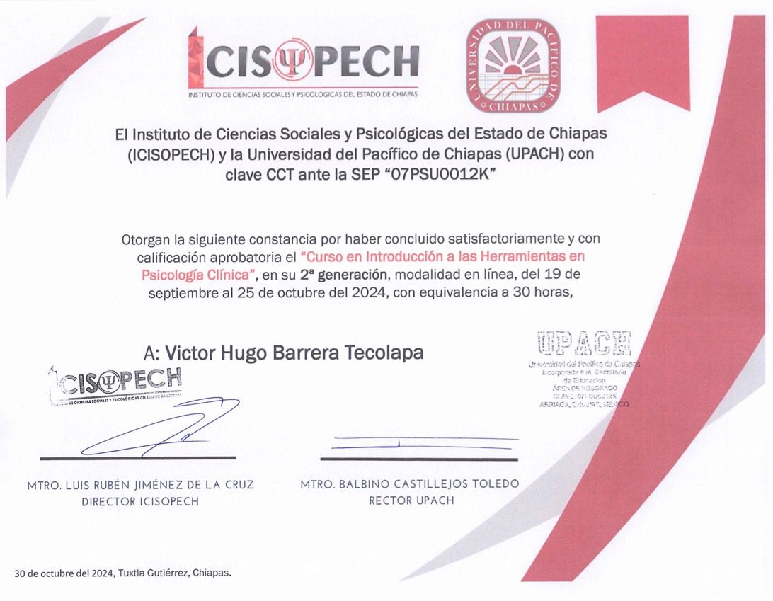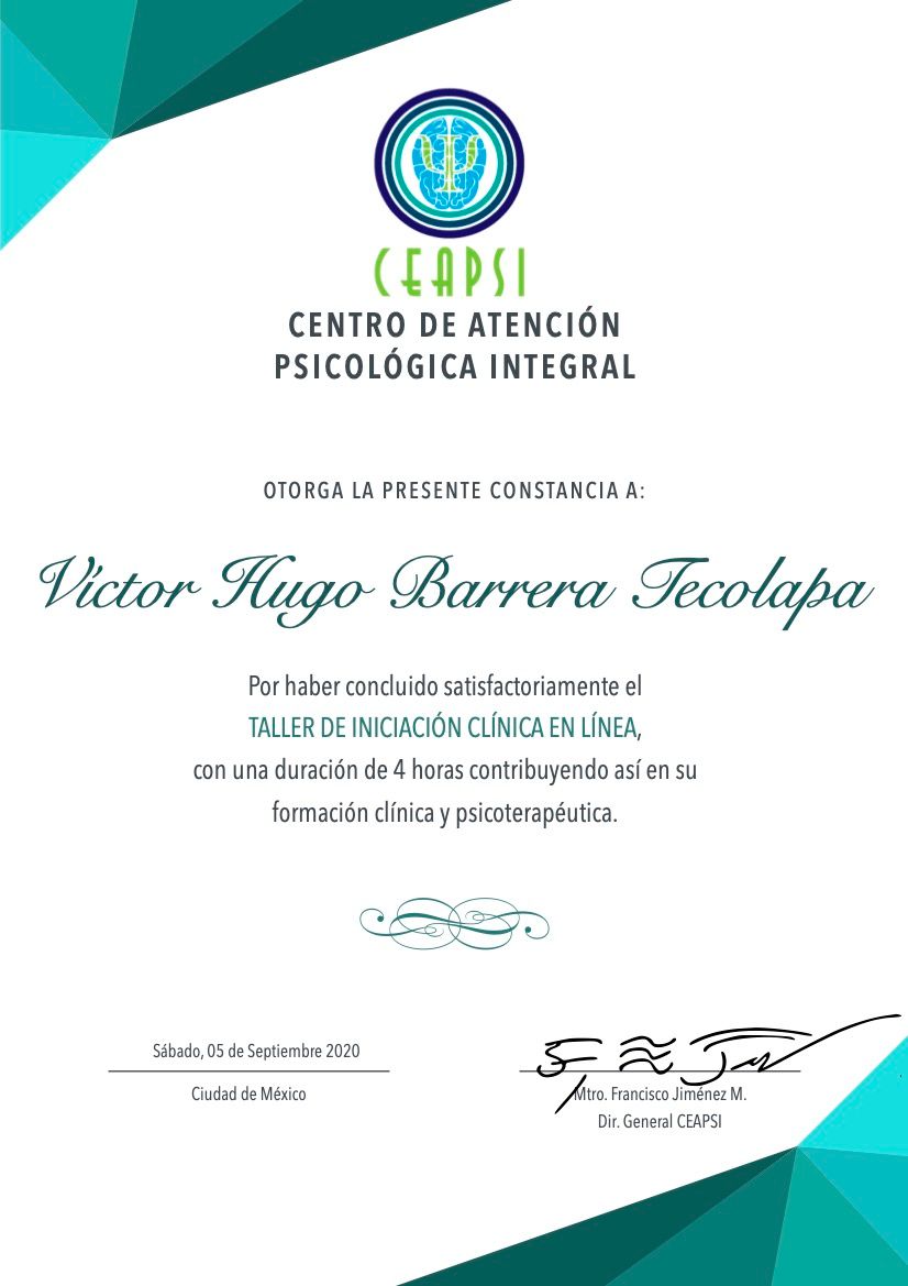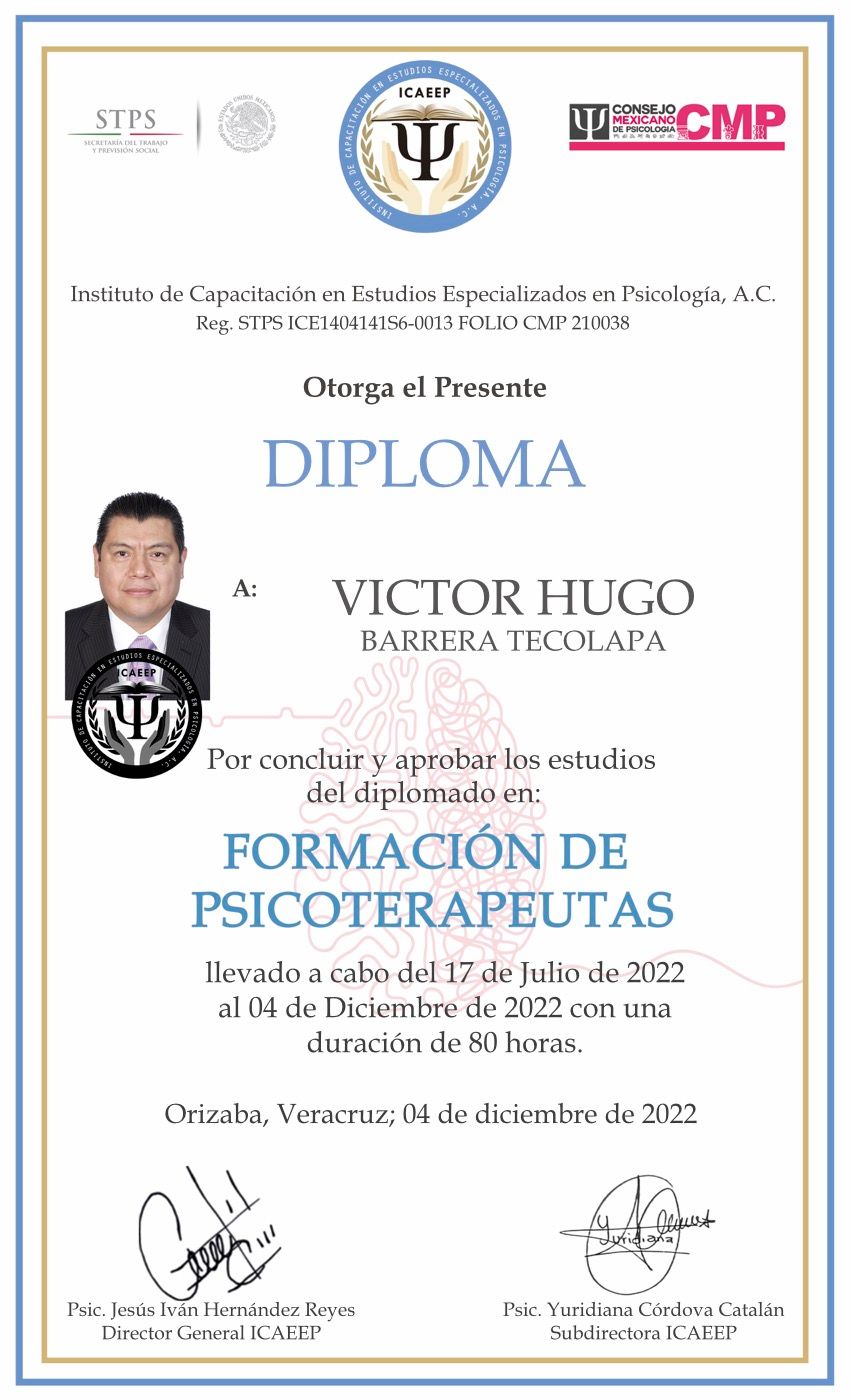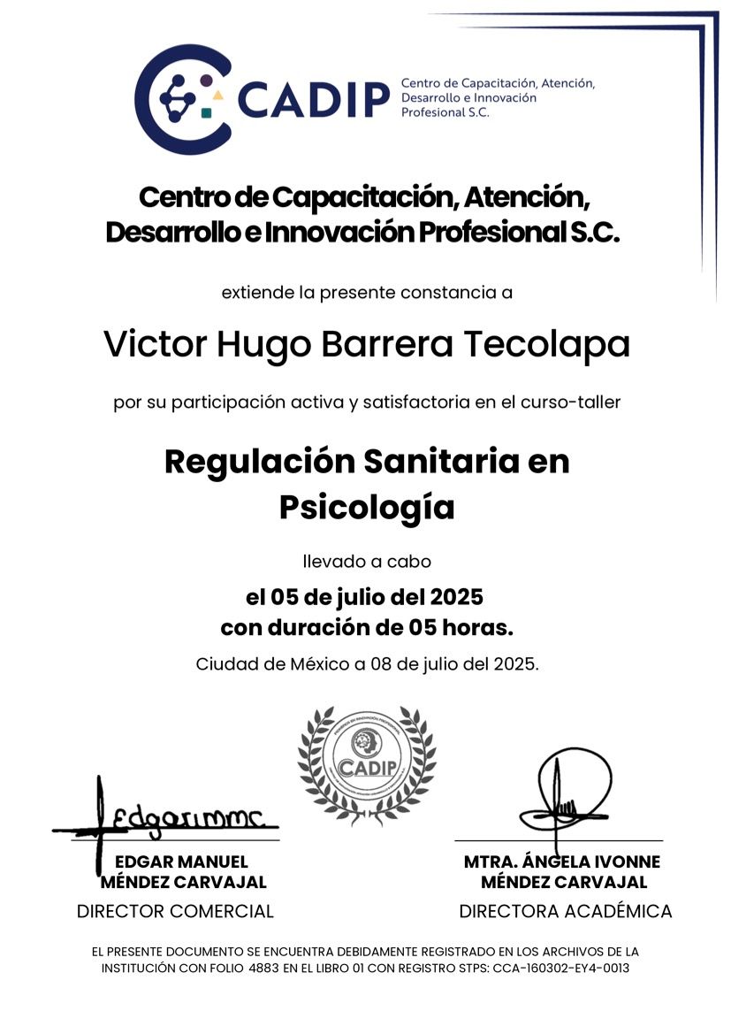 Hola, soy Victor Barrera, Psicólogo y Psicoterapeuta de adultos, mi modelo de intervención es el de la Terapia Cognitivo Conductual (TCC), he trabajado en el ámbito de la Salud Mental desde 2007. Me enfoco en provocar cambios mediante el tratamiento psicoterapéutico a través de la Terapia Cognitivo-Conductual. Me especializo en la evaluación, diagnóstico y tratamiento de la ansiedad, la depresión y el Trastorno de Estrés Postraumático (TEPT). Te ofrezco mi formación y experiencia profesional para modificar tu vida a través de la psicoterapia.