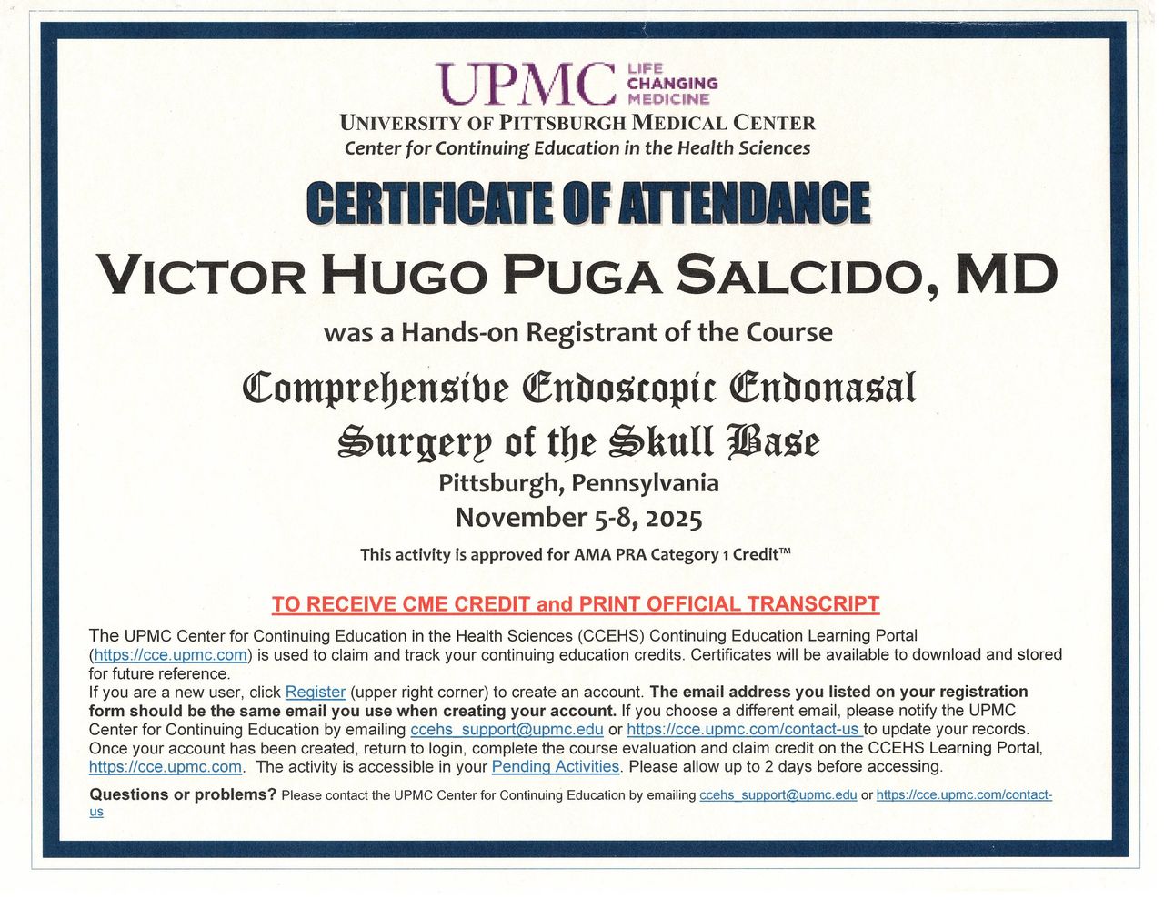 Cirugía de Base de Cráneo y Endoscopia: Entrenamiento especializado en la University of Pittsburgh (UPMC), EE. UU., institución líder mundial en el abordaje endoscópico endonasal y técnicas de mínima invasión craneal.