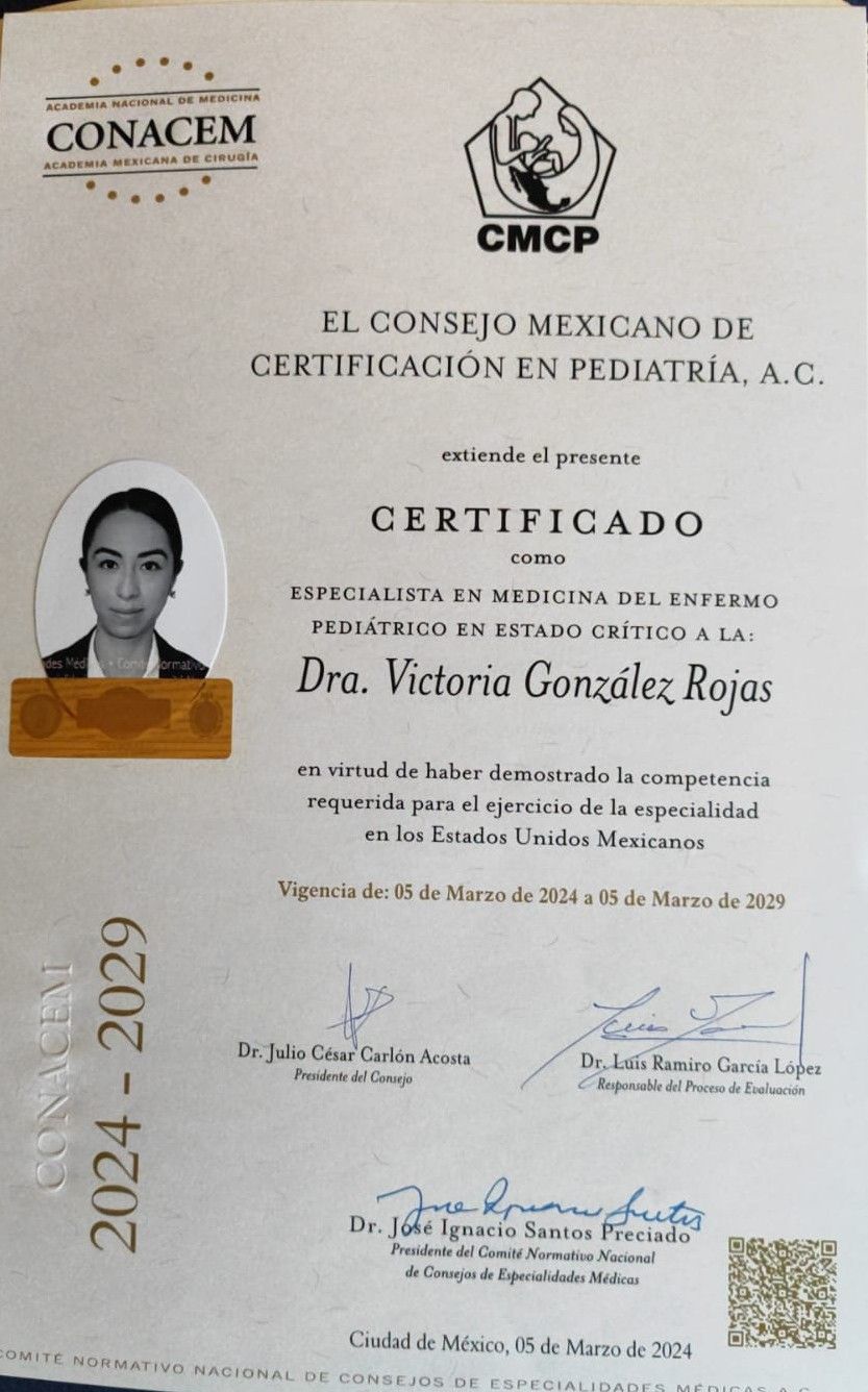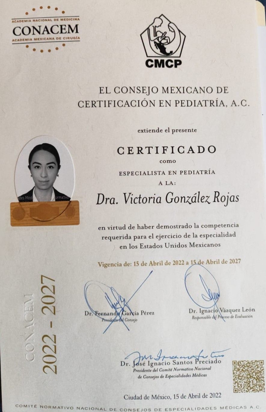 Hola! Soy la Doctora Victoria González, egresada como médico cirujano en la Facultad de Medicina de la Universidad La Salle y titulada con mención honorífica. Estudié mi especialidad en pediatría en el Hospital Infantil de México Federico Gómez, cuna de la pediatría en México. Actualmente me encuentras en la Ciudad de México con el objetivo de brindarle a tus hijos la mejor atención, y a ti, la tranquilidad de que tu pequeño está en buenas manos.