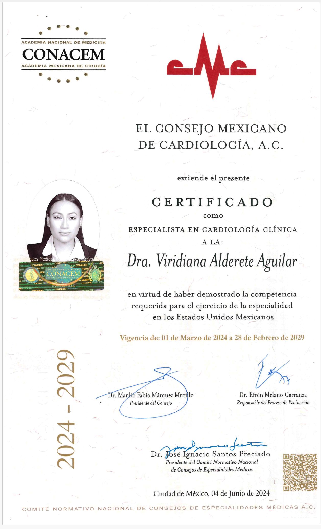 Hola! Soy la Dra. Viridiana Alderete, especialista en Cardiología Clínica. Soy originaria de Ciudad Juiárez. Egresada de medicina general de la Universidad Autonoma de Ciudad Juárez y realicé mi especialidad en Centro Médico Nacional del Noroeste, en Obregón, Sonora avalado por la Universidad Autónoma de Sinaloa
