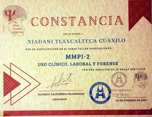 Me dedico al diagnostico y tratamiento de salud mental, desde un enfoque mixto. Utilizo instrumentos de diagnostico confiable y validos que me ayudan a identificar y entender con exactitud, las diferentes necesidades de mis pacientes. 5 de años de experiencia. Licenciada en Psicología - 11658552 Maestría en Psicopedagogía - 13180757 Formación en Psicoterapia. Formación profesional para el peritaje psicológico. Curso taller especializado MMPI-2 Uso clínico, laboral y forense Lengua de Señas Mexicana