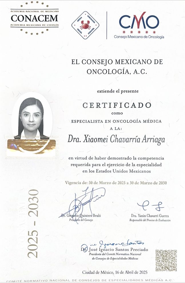 Soy la Dra. Xiaomei Chavarría Arriaga, Oncóloga Médica con sólida formación en Medicina Interna, y me especializo en la atención integral de pacientes con cáncer. Mi enfoque se basa en ofrecer tratamientos personalizados, sustentados en evidencia científica, con una atención humana, empática y cercana, entendiendo que cada paciente y cada diagnóstico son únicos.