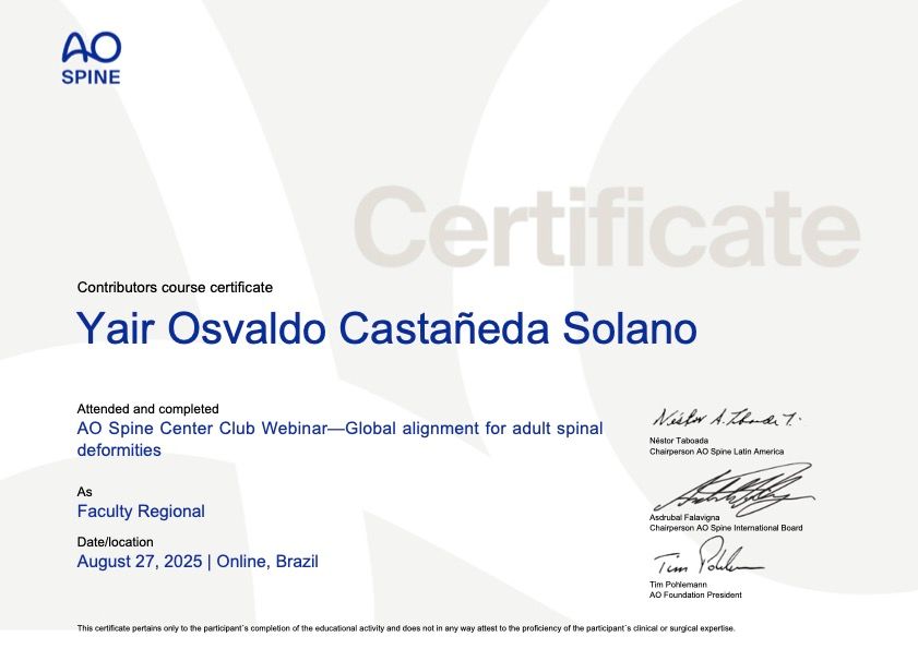 Soy el Dr. Yair Osvaldo Castañeda Solano, especialista en Traumatología y Ortopedia con alta especialidad en Cirugía de Columna. Mi misión es ayudarte a recuperar tu movilidad, disminuir tu dolor y mejorar tu calidad de vida mediante tratamientos seguros, personalizados y basados en la evidencia científica más actual.