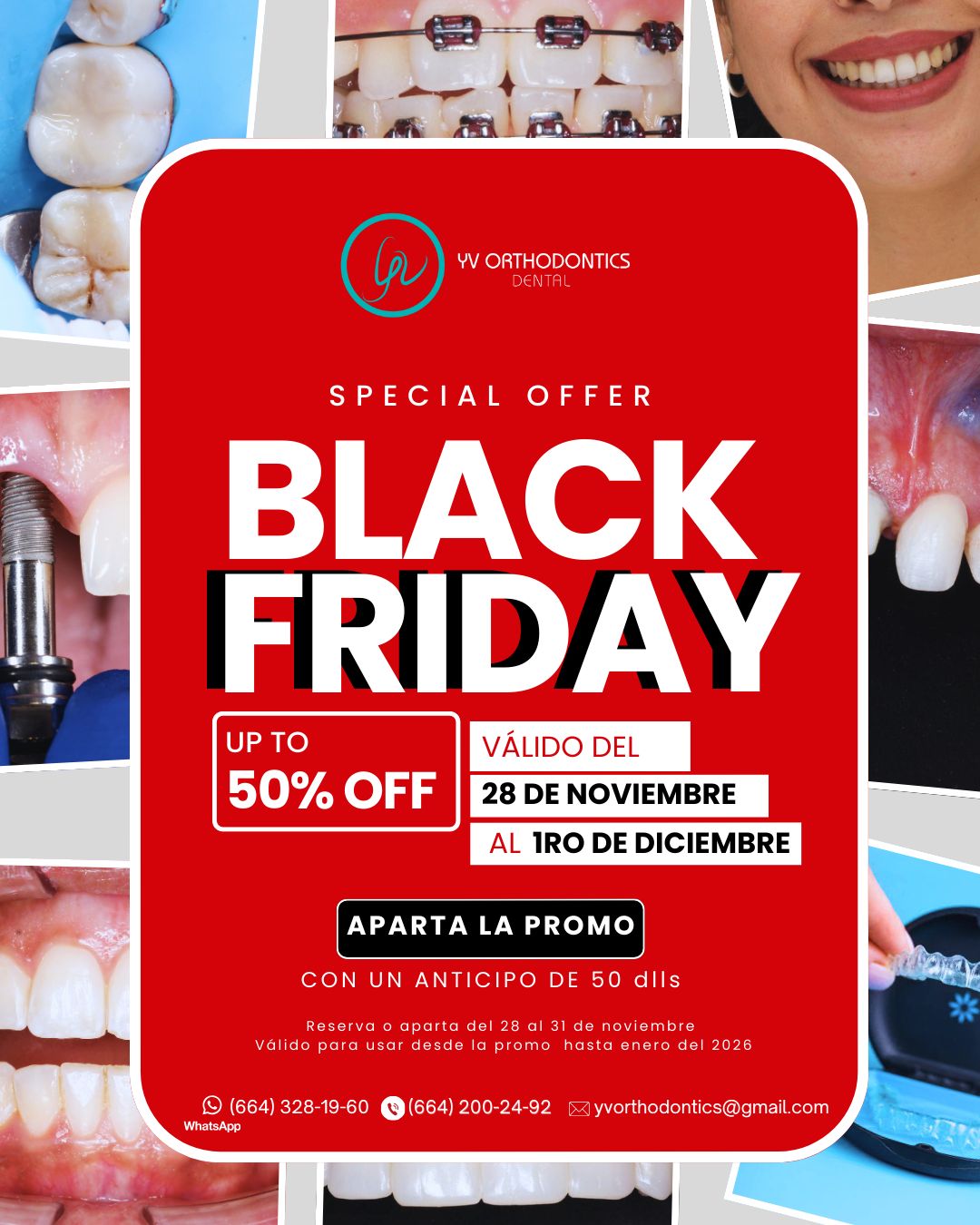 ¡Black Friday llegó a Dental YV Orthodontics! Preparamos promociones más fuertes que las del Buen Fin, pensadas para que puedas aprovechar este fin de año con los tratamientos que siempre has querido iniciar.