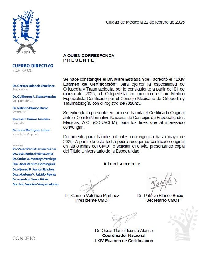 Medico Ortopedista con Alta Especialidad en Cirugía de Grandes Articulaciones (Hombro, Rodilla y Cadera)