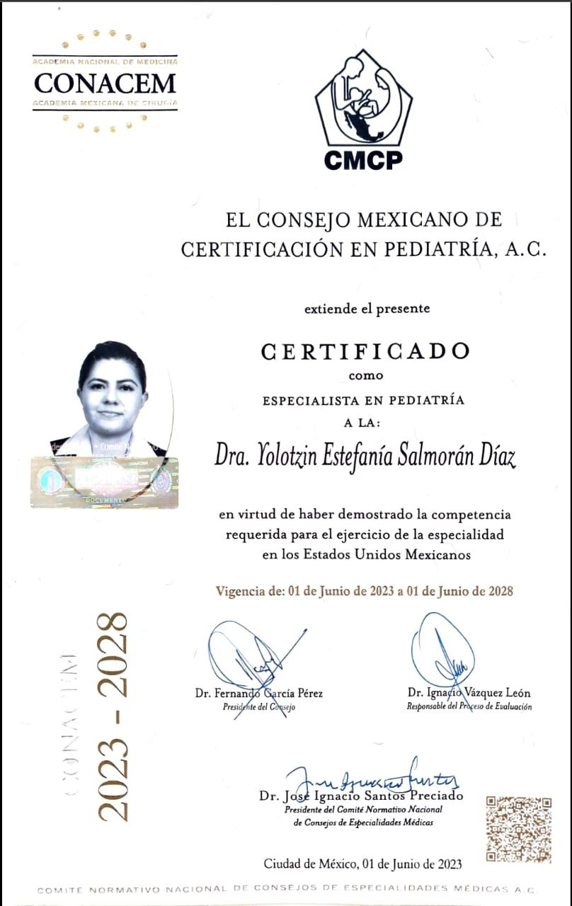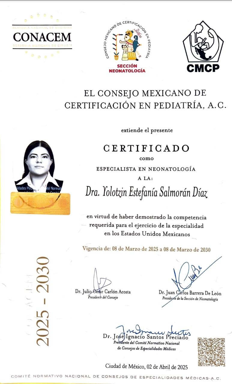 Hola, soy la Dra. Yolotzin Díaz. Soy Pediatra y Neonatóloga, egresada del Hospital de Pediatría CMN Siglo XXI, avalado por la UNAM y certificada por el Consejo Mexicano de Certificación en Pediatría y Neonatología.
