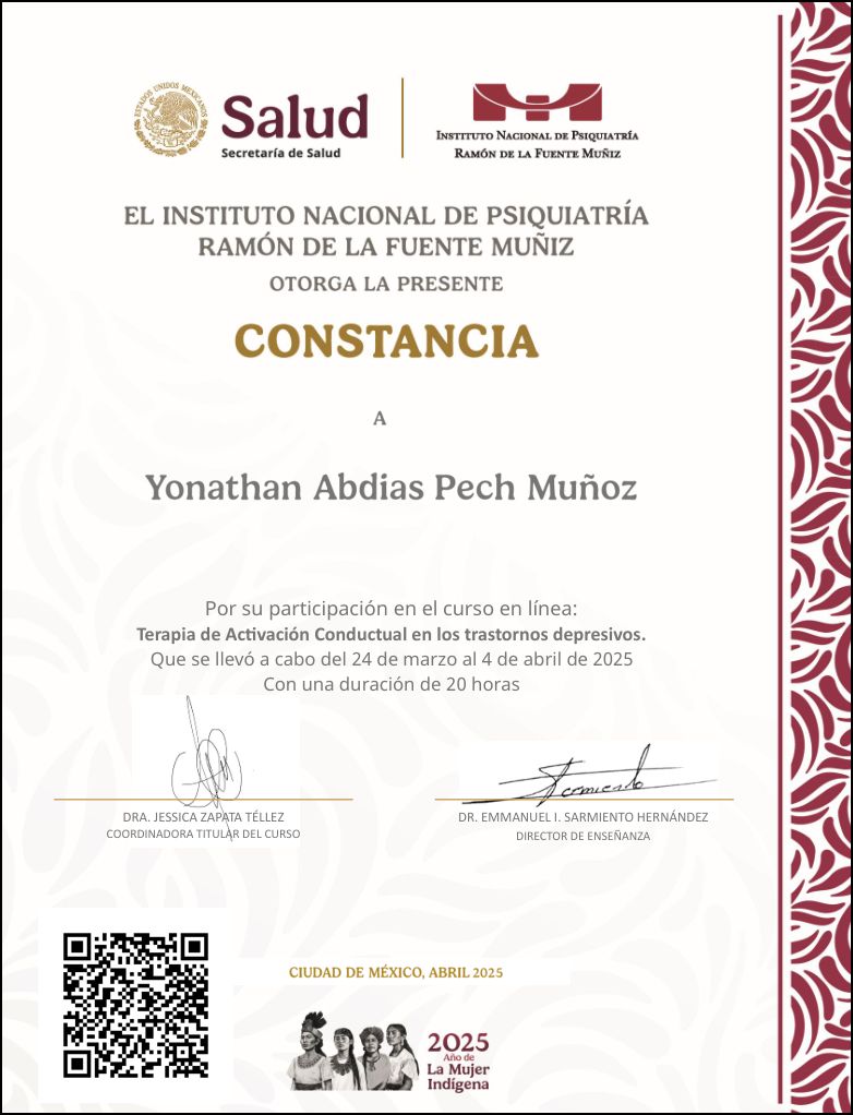 Gracias a este proceso me siento más consciente, más tranquila y con herramientas reales para enfrentar mis emociones. Lo recomiendo ampliamente.• Psic. Yonathan Pech Muñoz • Psicoterapia individual •
