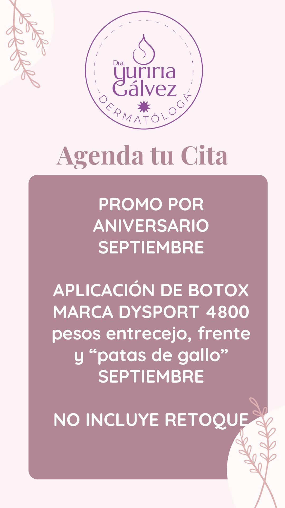 Por aniversario, en todo el mes de septiembre aplicación de toxina botulínica marca Dysport en frente, entrecejo y patas de gallo 4800 pesos. No incluye retoque