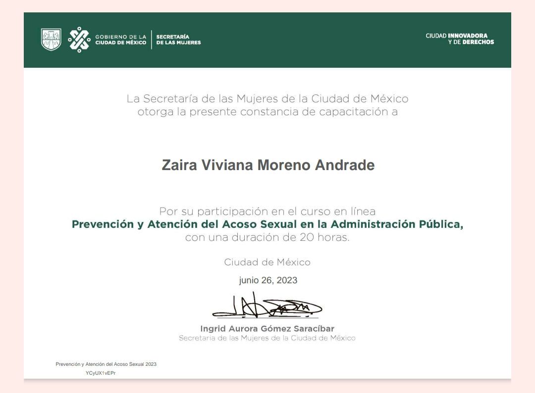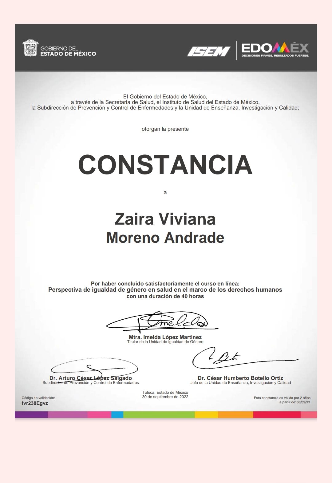 ¡Hola! Soy la Licenciada Zaira Moreno, psicóloga certificada en intervención psicoterapéutica por el Instituto de Capacitación en Estudios Especializados en Psicología. Cuento con una sólida formación en prácticas basadas en evidencias, incluyendo un diplomado en Terapia Cognitivo Conductual por el Instituto Nacional de Neuroeducación. Además de una variedad de cursos, capacitaciones y talleres teórico/prácticos en Terapia Racional Emotivo Conductual, Terapia Dialéctico Conductual y Terapia de Aceptación y Compromiso.