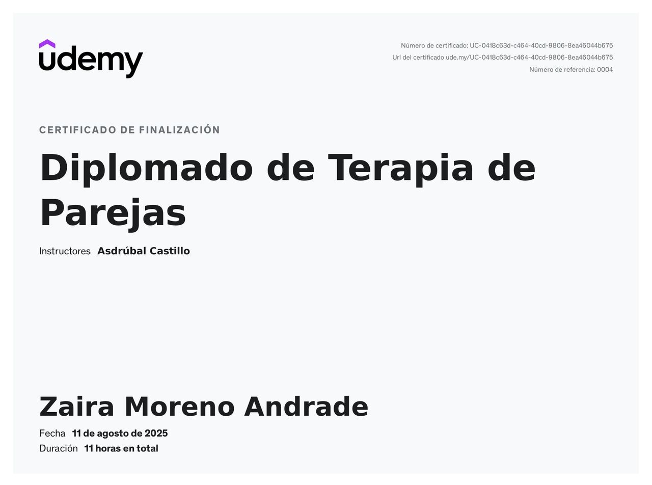 Cuento con un diplomado en terapia de pareja, intervención y prevención de conducta suicida y atención a víctimas de violencia de género.
