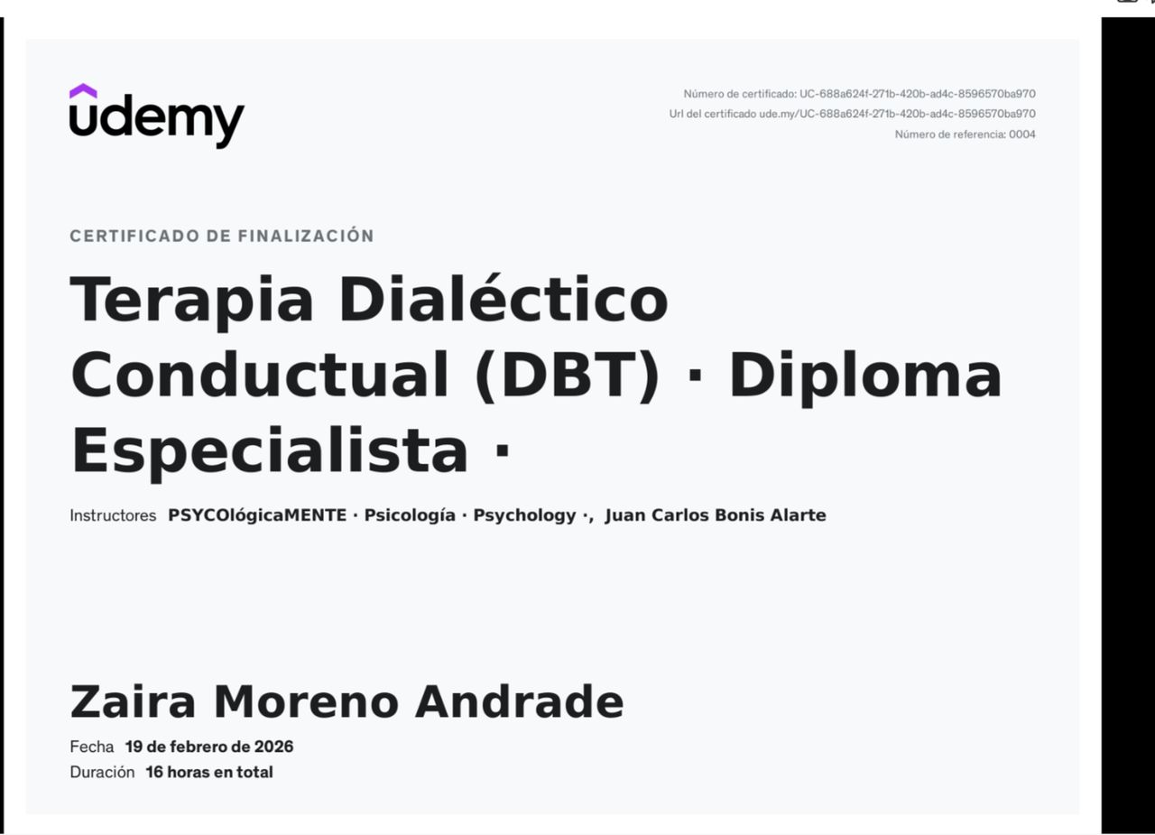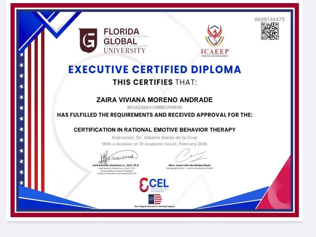 ¡Hola! Soy la Licenciada Zaira Moreno, psicóloga certificada en intervención psicoterapéutica por el Instituto de Capacitación en Estudios Especializados en Psicología y Certificada internacionalmente en Terapia Racional Emotivo Conductual por la Universidad de Florida. Cuento con una sólida formación en prácticas basadas en evidencias, incluyendo un diplomado en Terapia Cognitivo Conductual por el Instituto Nacional de Neuroeducación y Diplomado en Terapia dialéctico conductual (DBT).